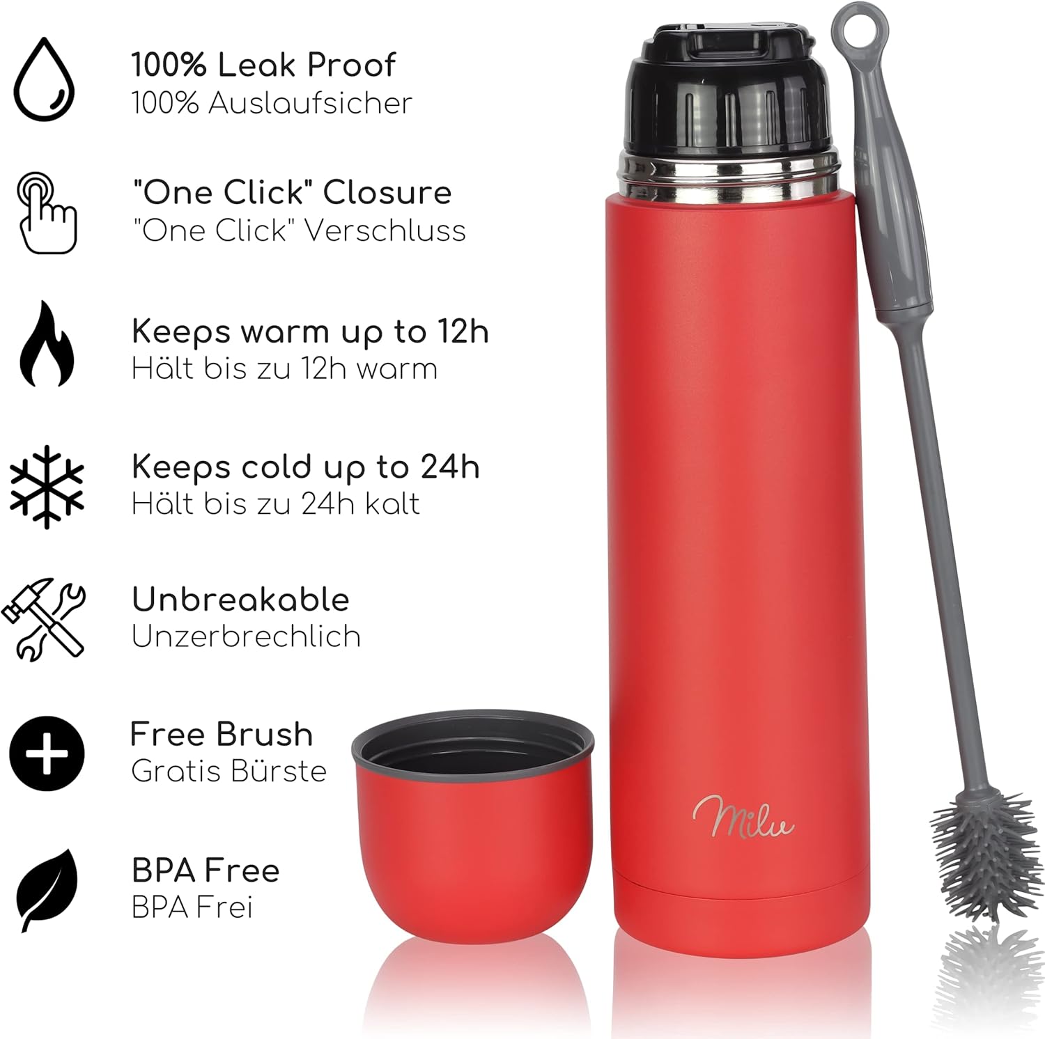 Milu Thermosflasche Thermoskanne Isolierflasche 1L, 750ml, 500ml - Isolierte Edelstahl Trinkflasche,