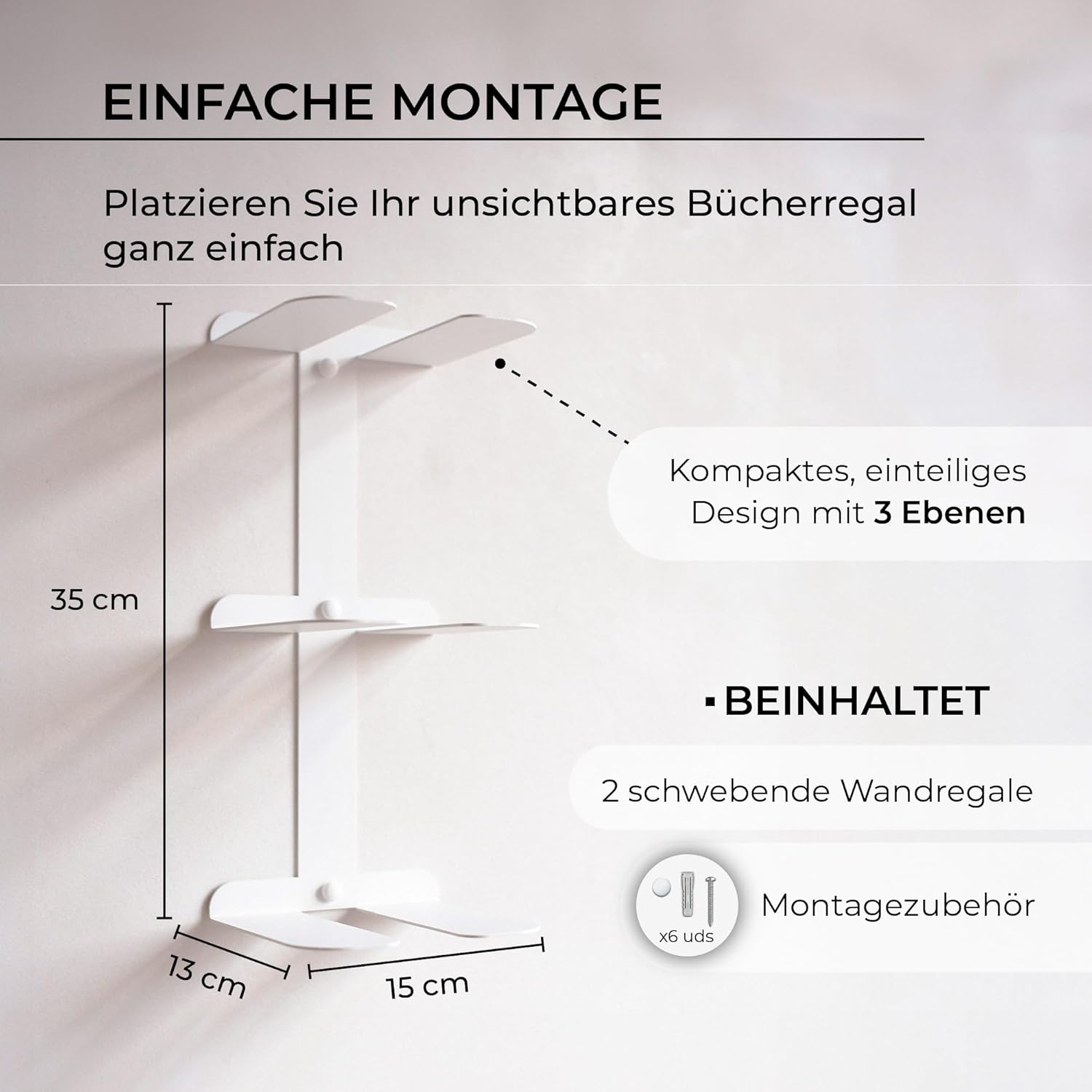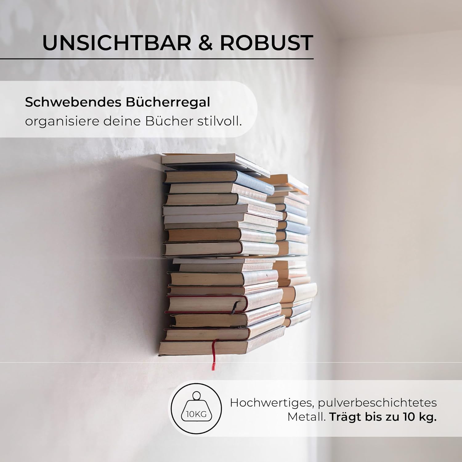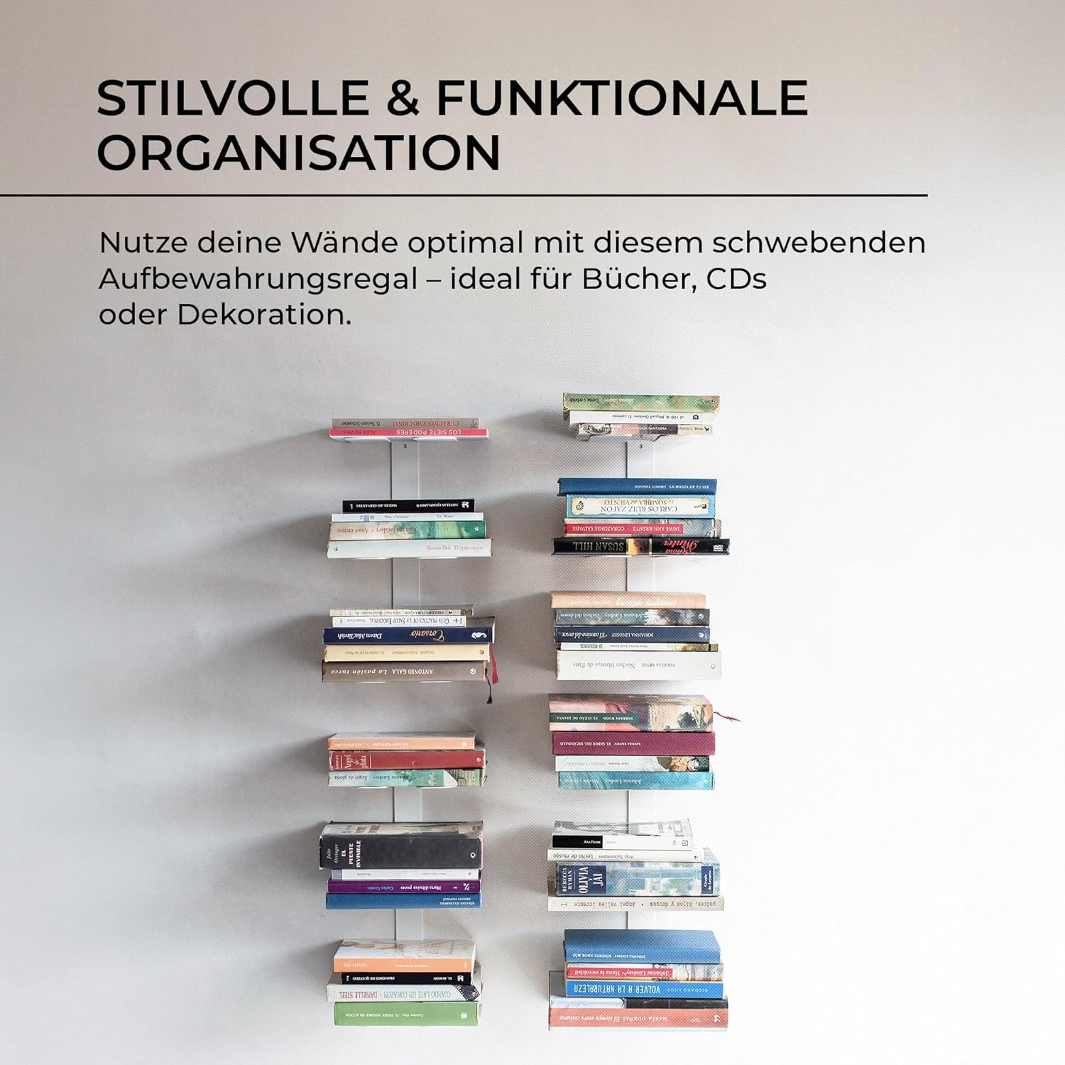 - [UNSICHTBAR] Ermöglicht eine vertikale Platzierung Ihrer Bücher, CDs oder DVDs auf eine unsichtbare und originelle Art. Perfekt für schwebende Regale im Schlafzimmer oder als Bücherregal im Kinderzimmer oder als wandregal badezimmer.