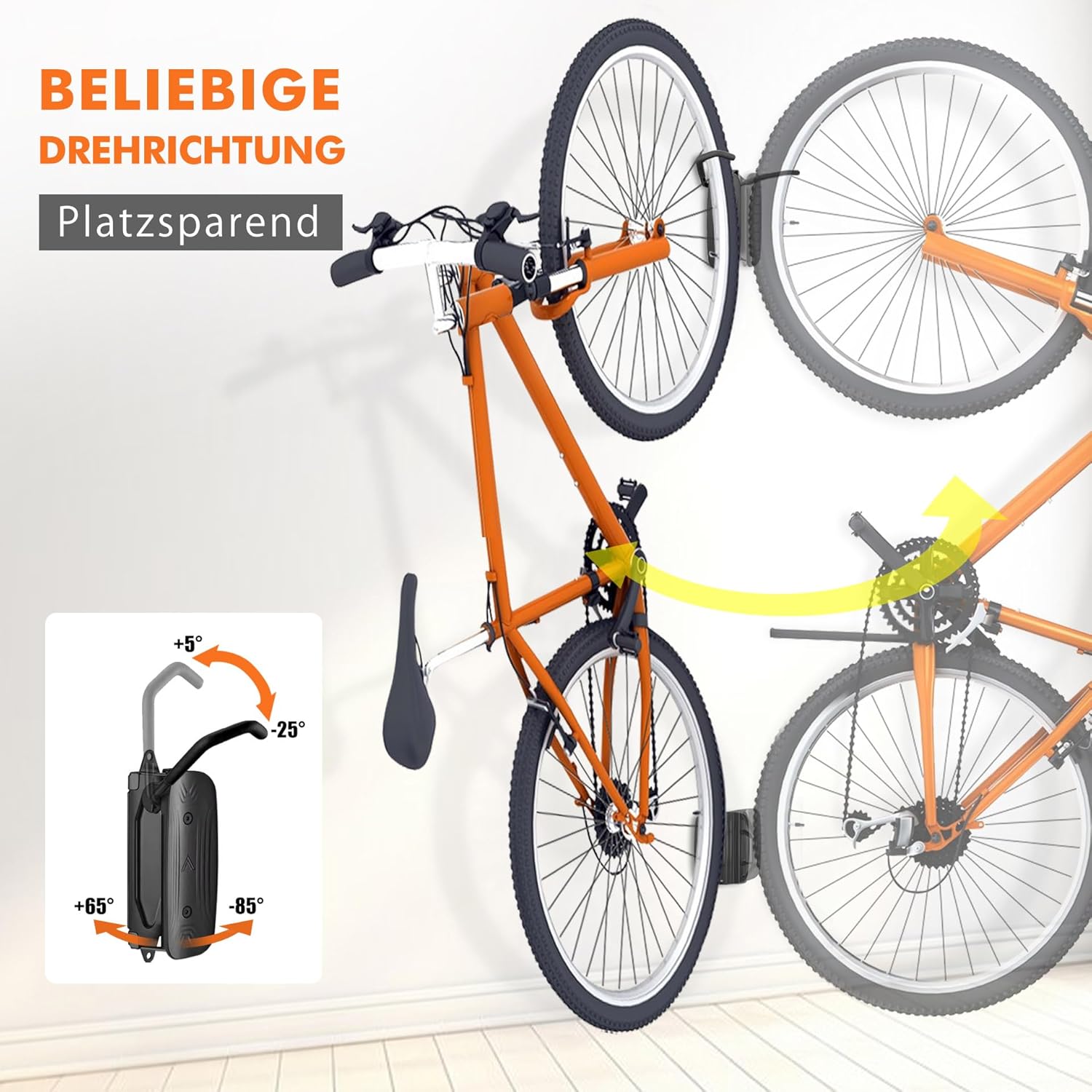 - Drehbarer Mechanismus: Dieser Fahrradträger verfügt über eine einzigartige drehbare Halterung, mit der Sie Ihr Fahrrad nahe an der Wand schwenken können, um zusätzlich Platz zu sparen. Diese Funktion ist besonders praktisch in engen Räumen, da sie