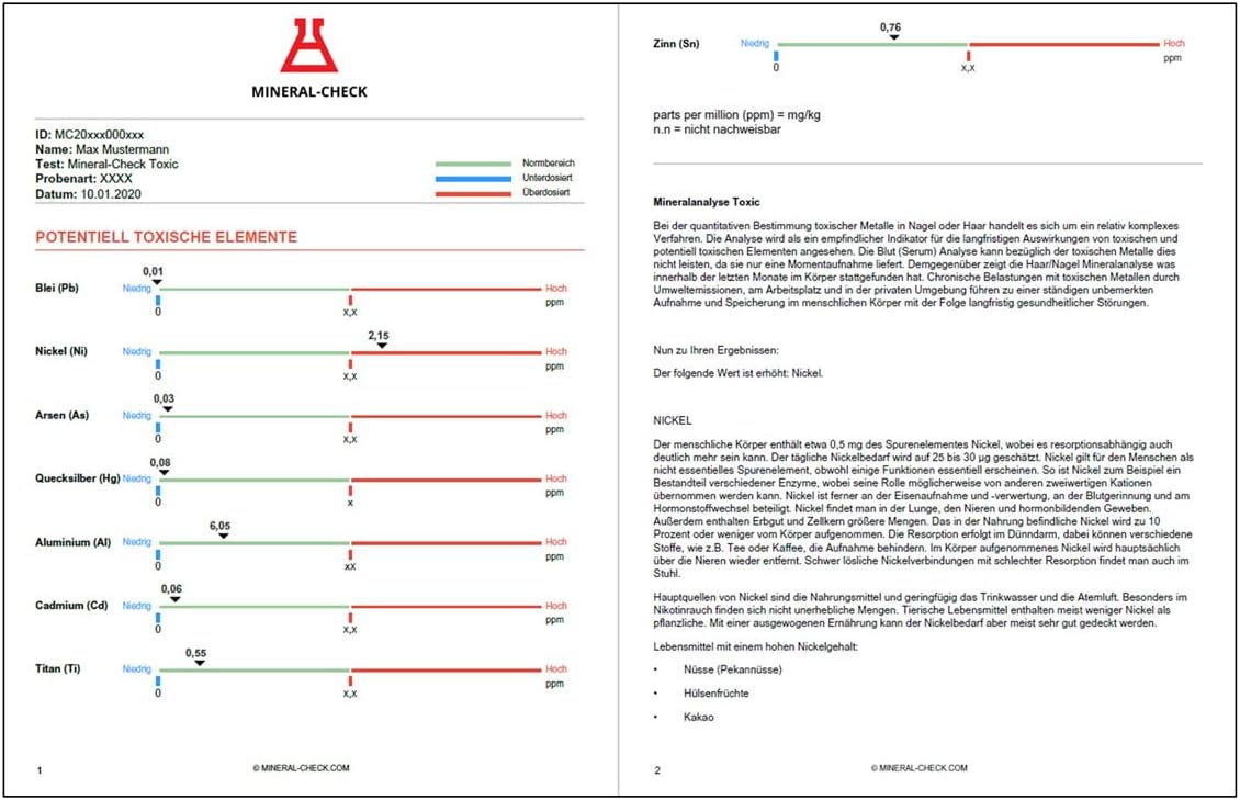 - Laborchemische Auswertung von Schwermetallen im Körper. Diese gefährlichen Elemente werden mittels Nagel oder Haaranalyse getestet; Arsen, Aluminium, Cadmium, Quecksilber, Blei, Nickel, Zinn,Titan.