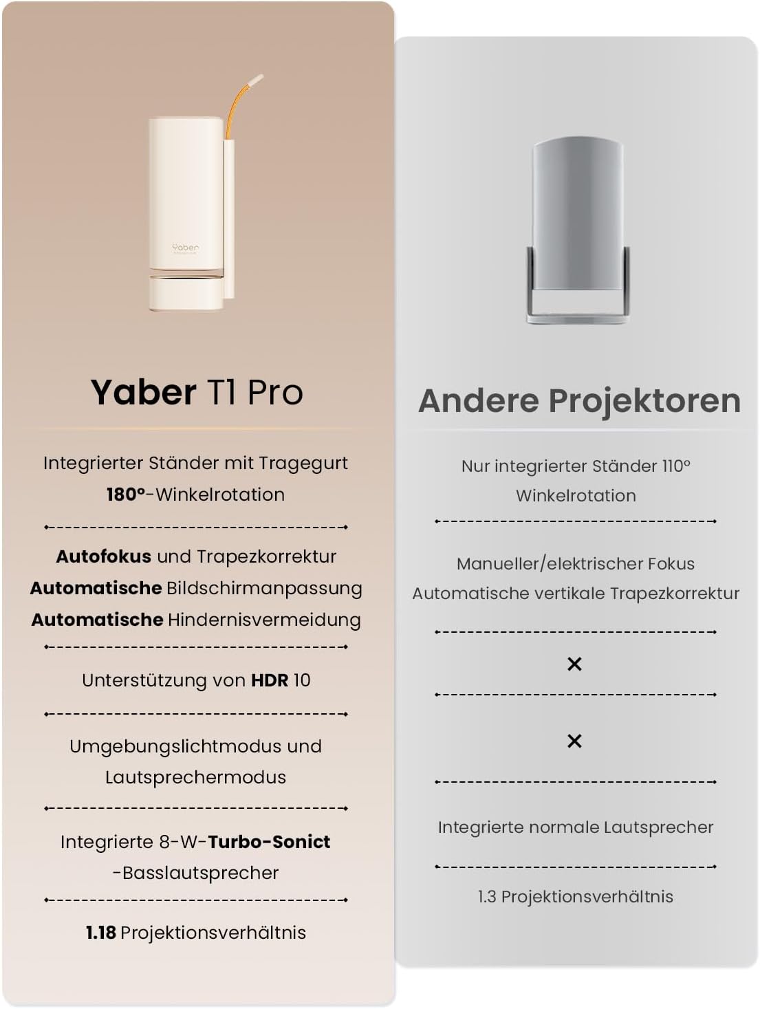 - 【HDR10 & Native Full HD 1080P】HDR10 verbessert Kontrast und Farbgenauigkeit, wodurch helle Szenen lebendiger und dunkle Szenen tiefer wirken und jedes Detail zum Leben erweckt wird. Dank seiner nativen 1080p-Auflösung bietet der Yaber T1 Pro beamer
