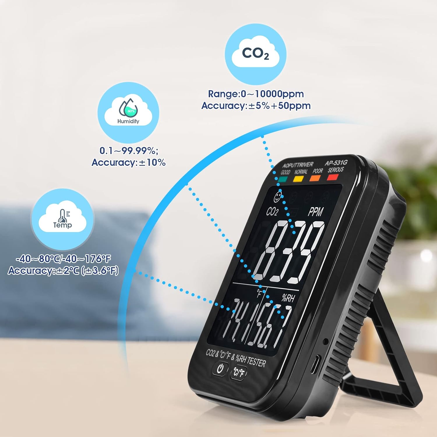 - Modisches Aussehen: AP-531G CO2-Detektor, Handheld-Grösse: 5,04 x 3,5 x 1,46 Zoll und ein Gewicht von 0,5 lb. Es hat ein zartes Aussehen und ein einfaches Design. Es ist einfach, einen intelligenten Luftqualitätsmonitor zu tragen, der uns helfen kann,