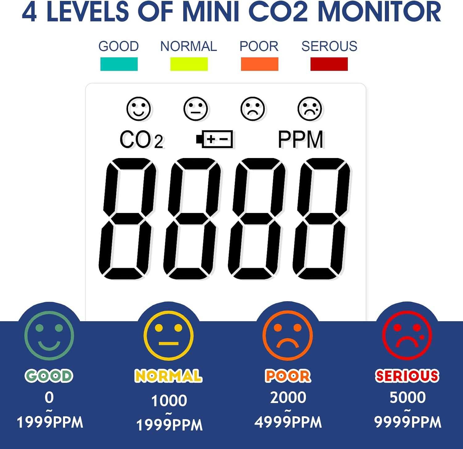 - Einzigartiges Design: Das Innenluft-CO2-Messgerät verfügt über zwei Arten von Luftqualitätswarnungen, nämlich zwei Alarmstufen und vier Gesichtsausdrücke zur Anzeige der CO2-Konzentration, wodurch die Luftqualität intuitiver wird. Ein