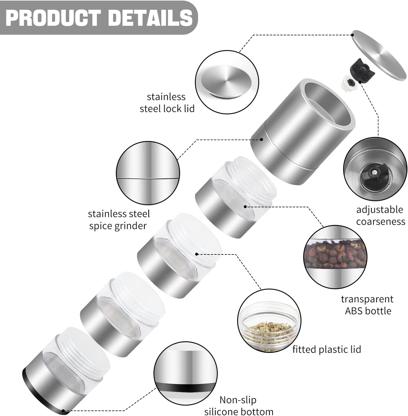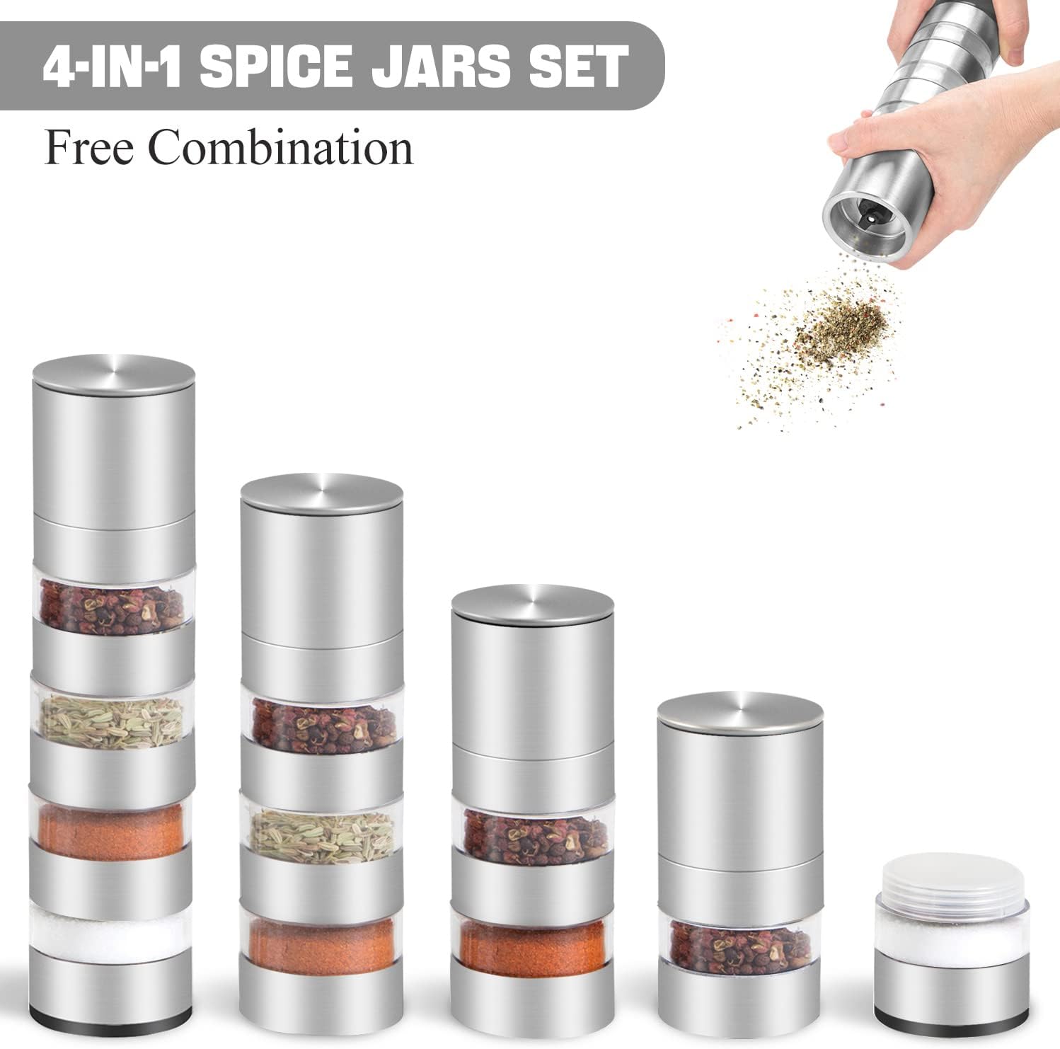 - 【4-in-1 Gewürzdosen】DASKING 4 in 1 mini Salzstreuer, mit Edelstahl Gewürzmühle, nimmt ausgezeichnete Herstellung prcoess, bequem zu speichern 4 verschiedene Gewürze, mehr Platz für Ihre kleine Küche zu speichern. Transparentes Gehäuse bietet