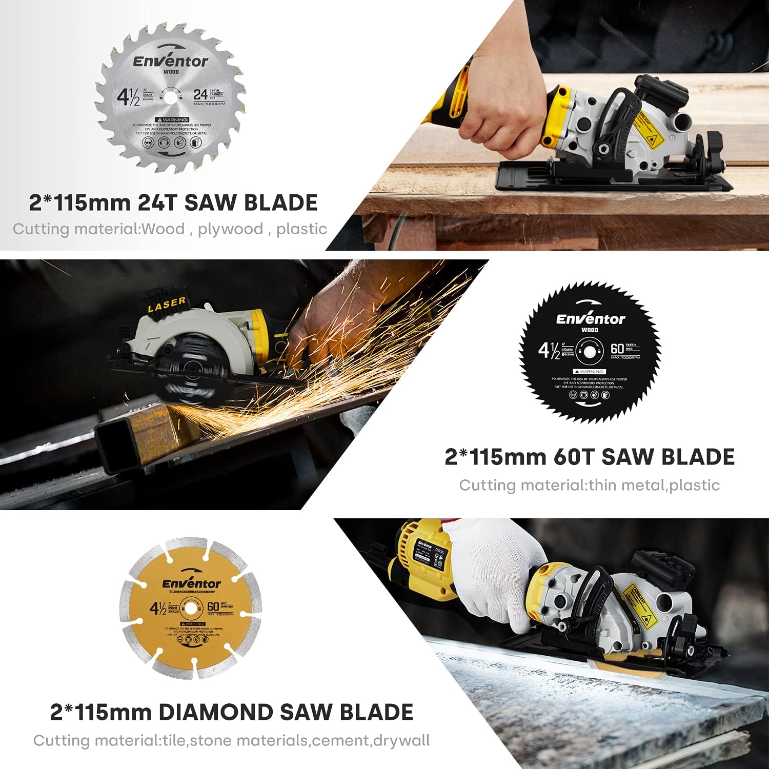 - 🔥【6 Sägeblatt】2 * 24T TCT (115 mm) für Holzschnitte / 2 * 60T HSS (115 mm) für Kunststoff- und Weichmetallschnitte / 2 * Diamantklinge (115 mm) für Fliesenschnitte.