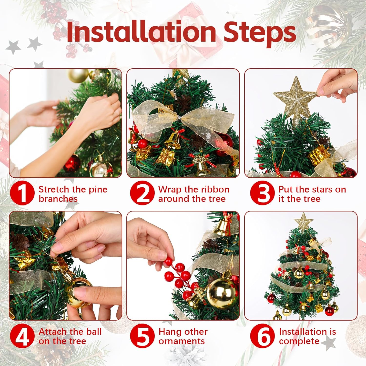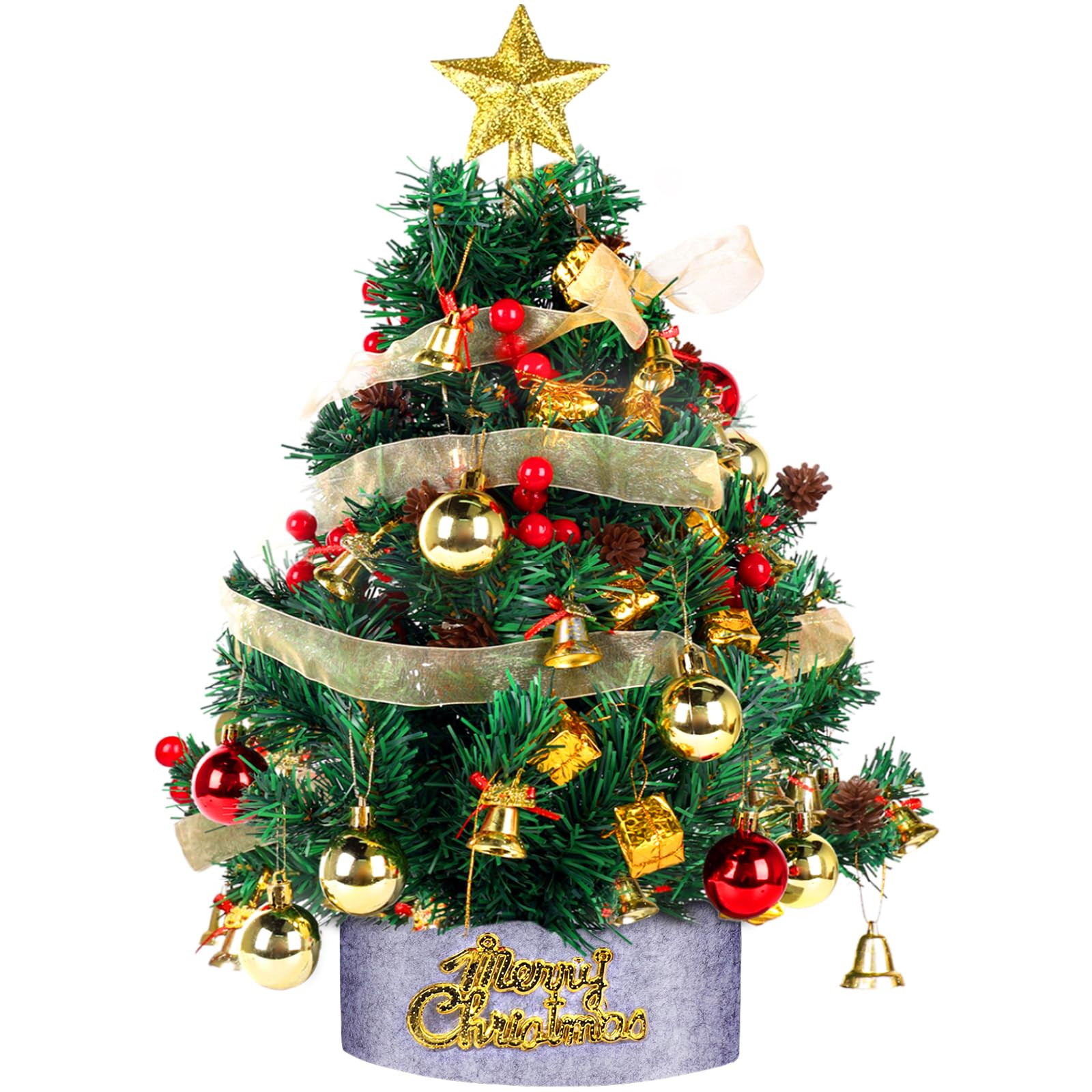 - Diy Schreibtisch Weihnachtsdekoration:Der Mini-Weihnachtsbaum ist ca. 2ft/60cm hoch.Enthält 1 Merry Christmas Baum Schürze,1 Treetopper Stern,1 Band Bogen Knoten,1 Stativ,6 rote Beeren,6 Kunststoff-Tannenzapfen,6 Geschenk-Taschen,10 kleine