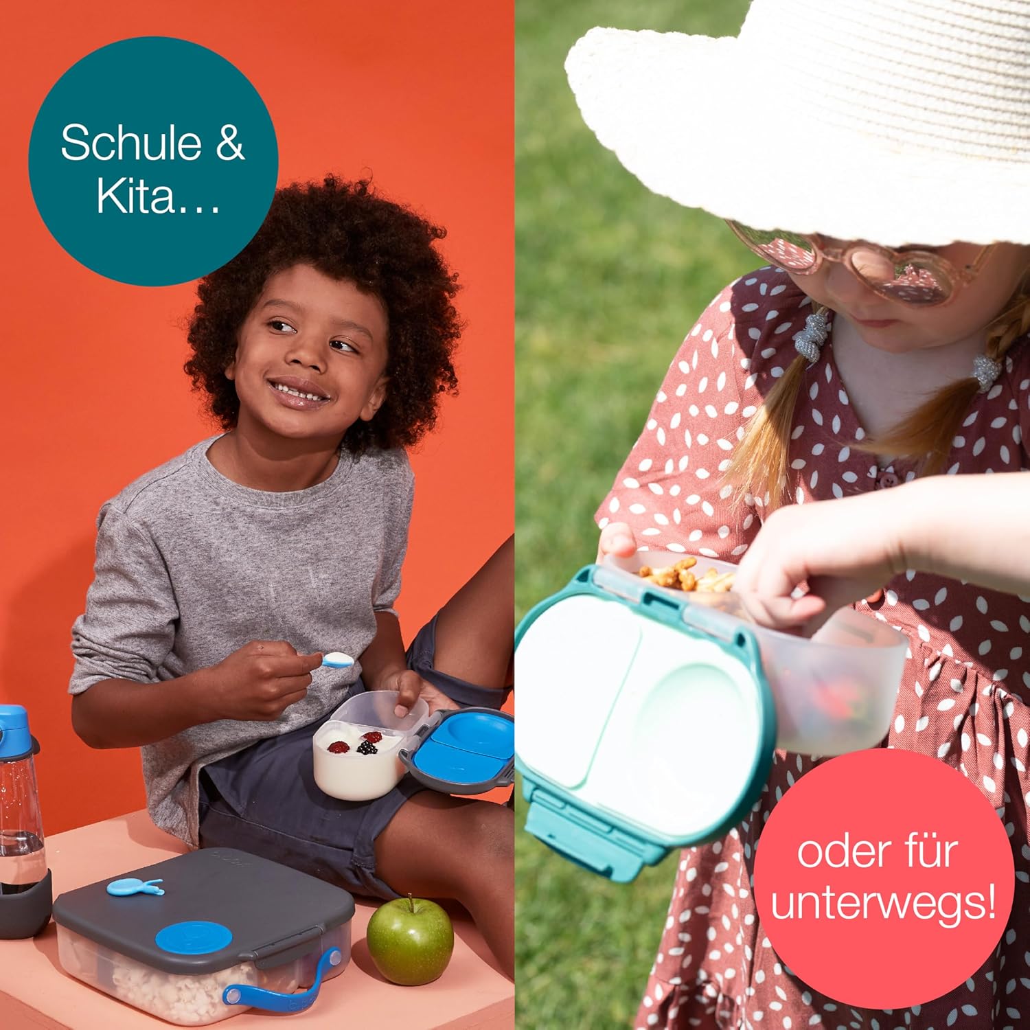 • 2 versiegelte Fächer sind auslaufsicher, um nasse Lebensmittel wie Püree, Joghurt und Dips zu sichern. Herausnehmbare Trennwand ermöglicht es Ihnen, die Fächergrösse anzupassen.