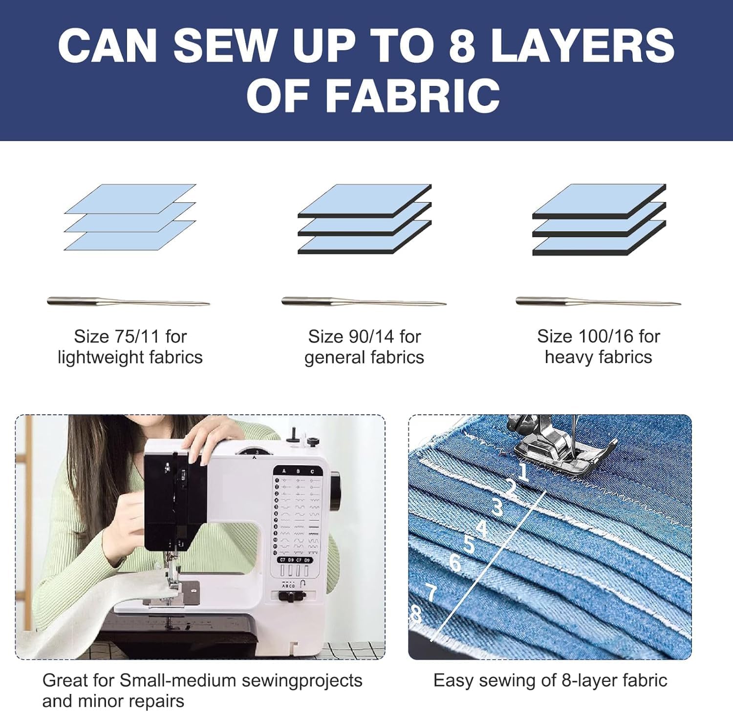 - GUTE NÄHLEISTUNG: Diese Nähmaschine ist für die Verarbeitung einer Vielzahl von Stoffen, einschliesslich strapazierfähigem Denim mit bis zu 8 Lagen, ausgelegt und verfügt über zwei Nähgeschwindigkeiten, darunter: Niedrige Geschwindigkeit – 350