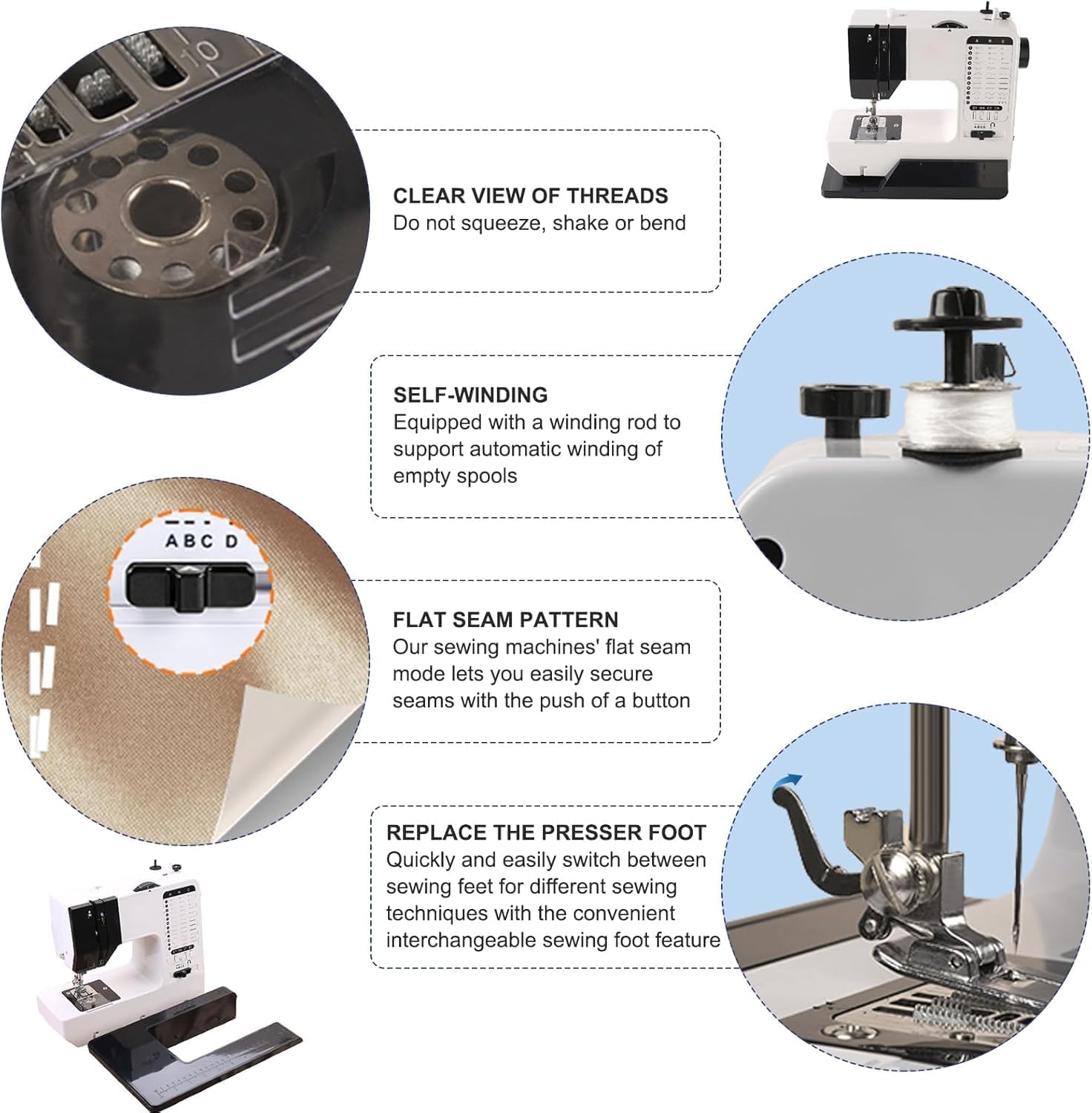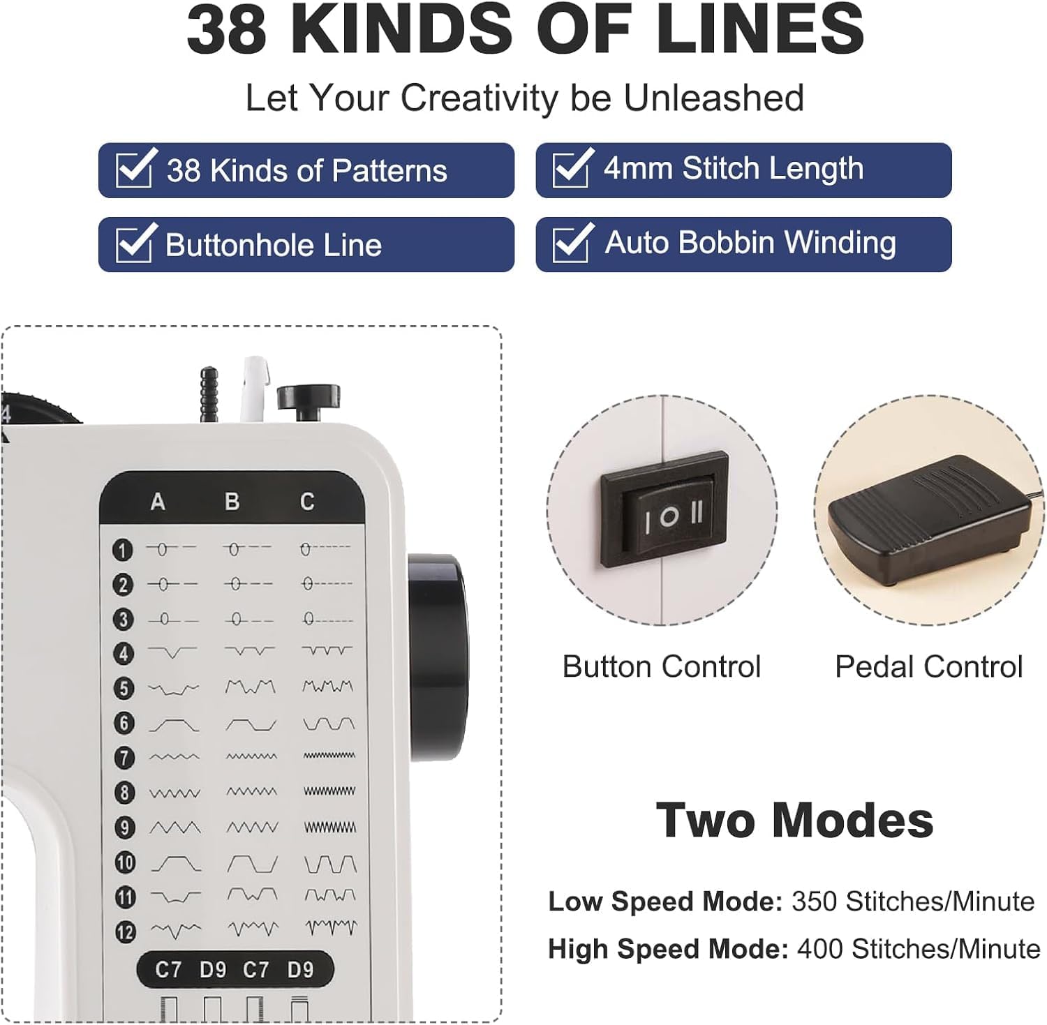 - 38 STICHOPTIONEN: Die Nähmaschine bietet 38 beeindruckende Sticharten zur Auswahl, um Ihren unterschiedlichen Nähanforderungen gerecht zu werden, darunter Geradstiche, Kurvenstiche, Knopflöcher, Knopfstiche und Reissverschlussstiche, sodass Sie Ihr