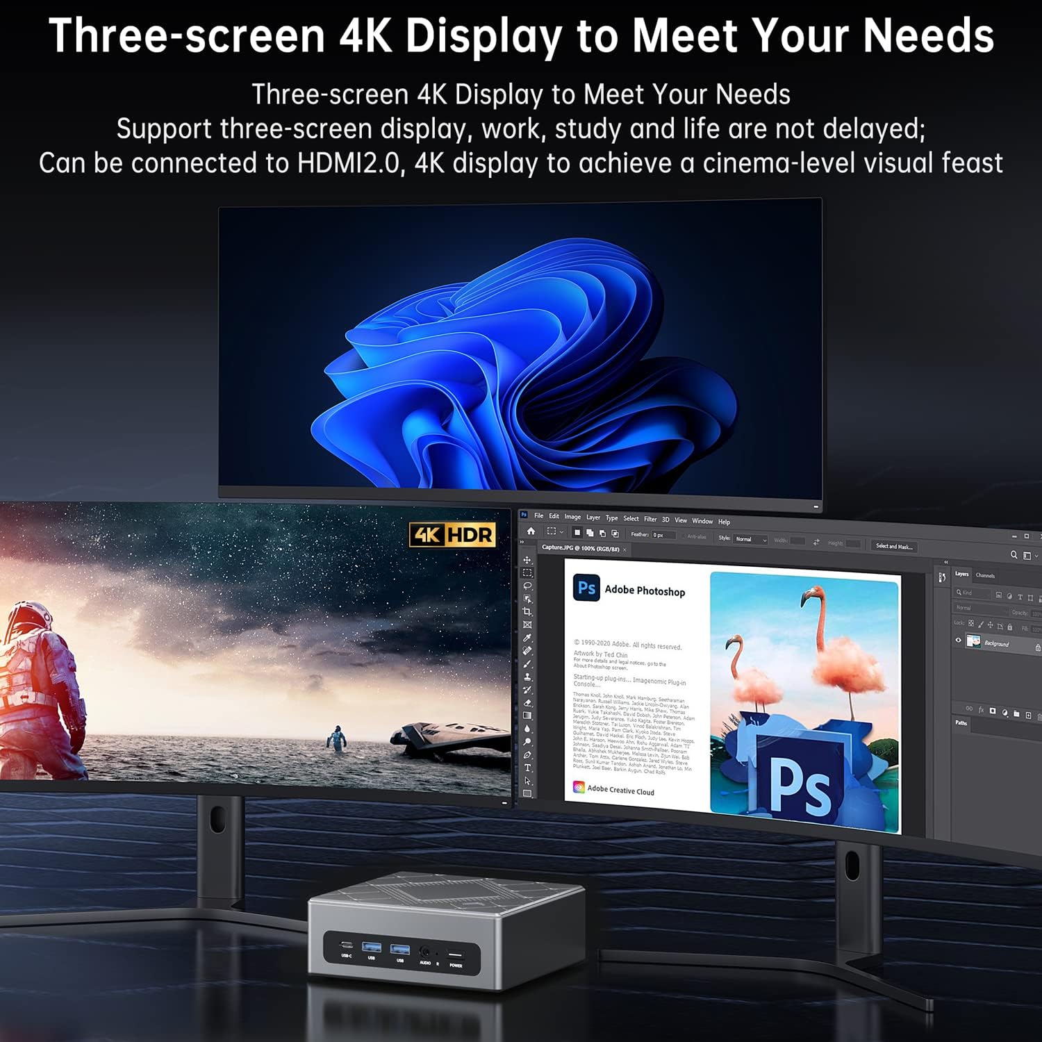 - 【Mächtige Leistung】 Der Mini-PC ist mit 16 GB DDR4 und 512 GB NVMe M.2 SSD ausgestattet, wodurch der kleine PC mehrere Hochleistungsvorgänge gleichzeitig ausführen kann. erreichen Sie mehr mit Multitasking über DDR4-Speicher, ideal für den reibungslosen Übergang zwischen arbeitslastintensiven Anwendungen