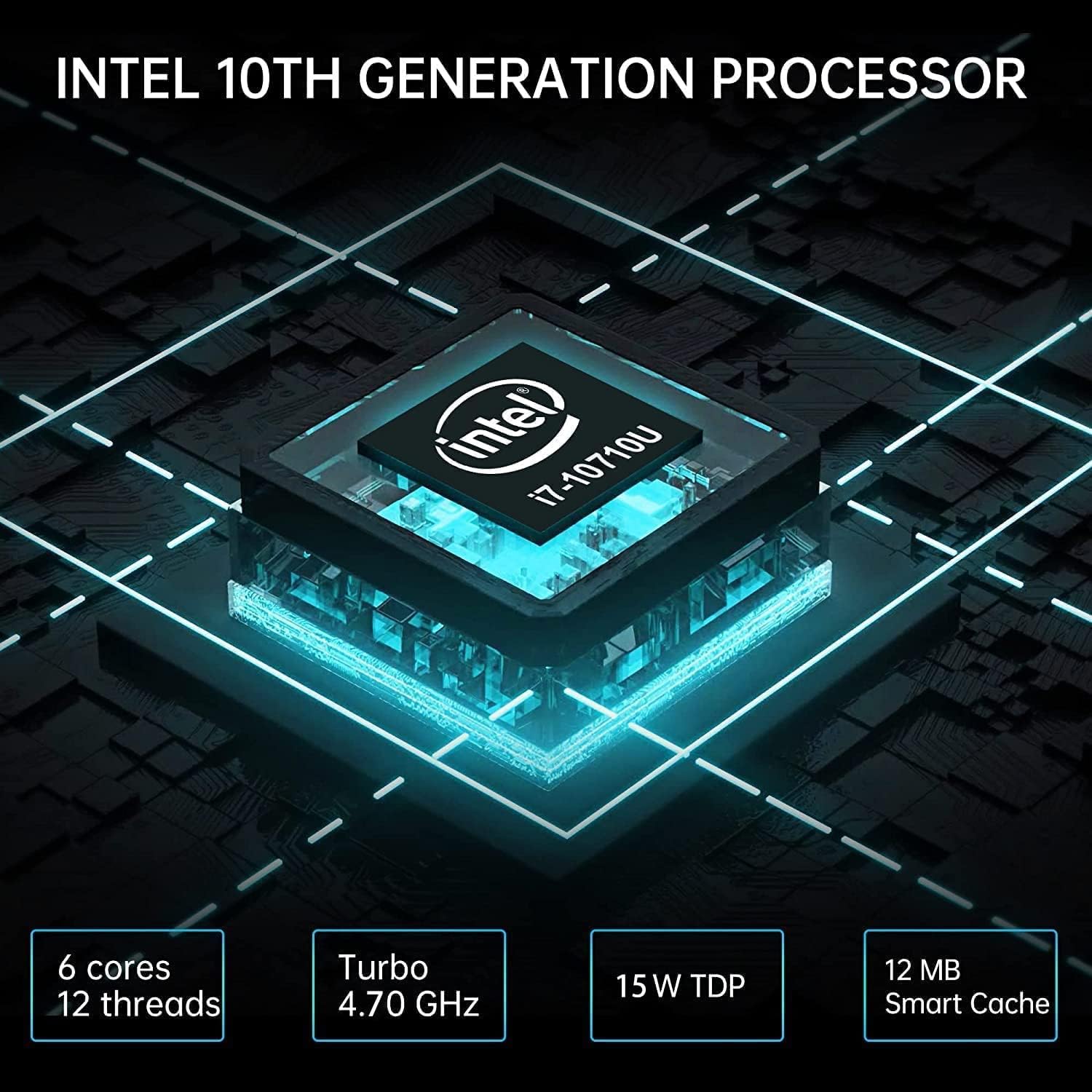- 【Leistung, um mehr zu erledigen】 Vorinstalliertes Windows 11 Pro-System, Mini-PC mit Intel 10. i7-10810U-Prozessor, 6 Kernen 12 Threads, maximaler Turbo-Frequenz 4,90 MHz, 12 MB Intel Smart Cache, mit neuer Hybrid-Core-Technologie, um Speicherplatz freizugeben für komplexere Workloads