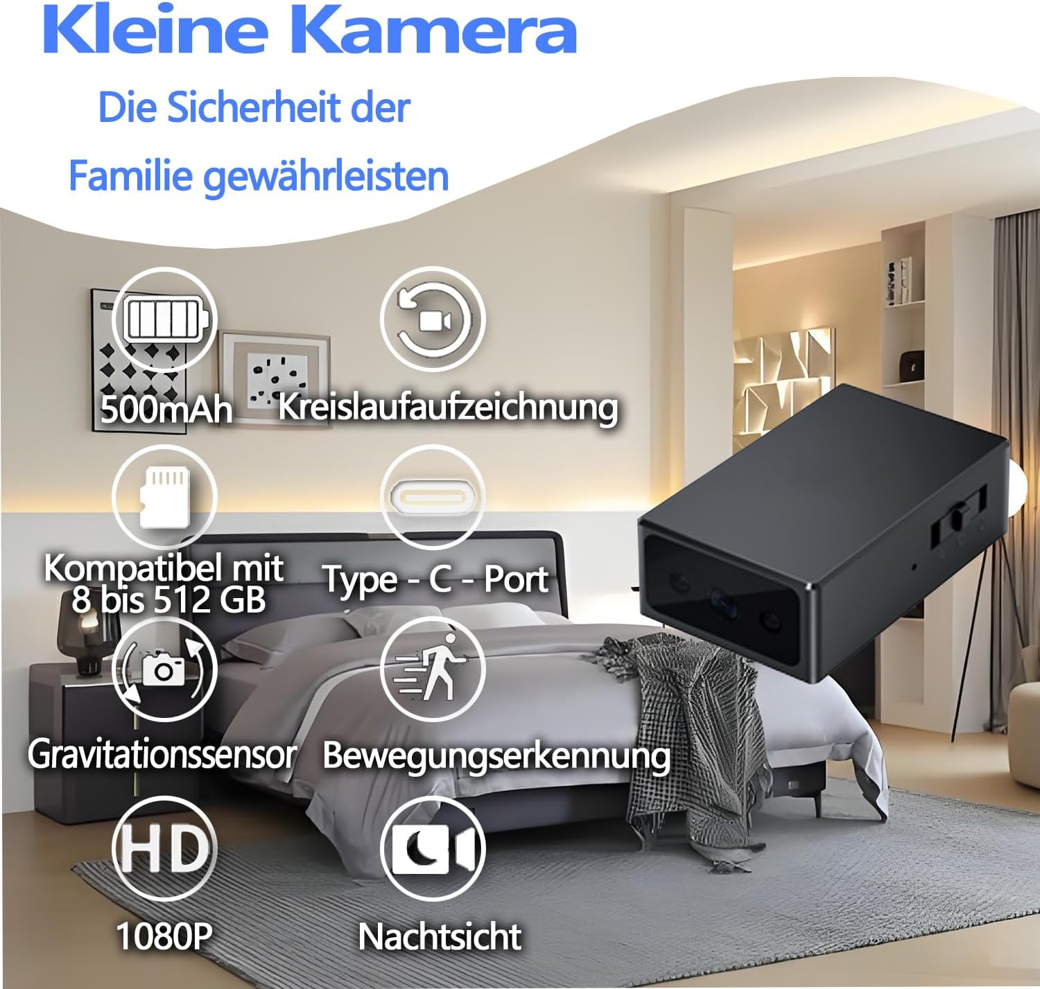 - Cette mini-caméra est équipée d'une batterie rechargeable de 500 mAh. Vous pouvez filmer pendant la charge et enregistrer automatiquement les fichiers lorsque la batterie est épuisée. Après l'achat de nos produits, nous vous offrons un