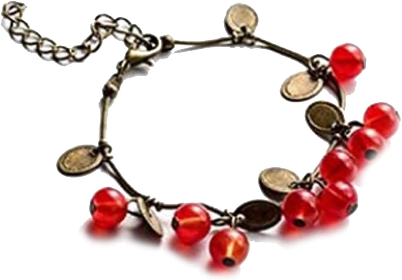 PRODUKTBESCHREIBUNGEN Schönes filigranes Armband in Bronze mit kleinen roten Perlen als Johannisbeeren. Material Anhänger: Kunststoff, Metall Material Armband: Metall Armbandlänge: 17-21cm Lieferumfang: 1 Armband