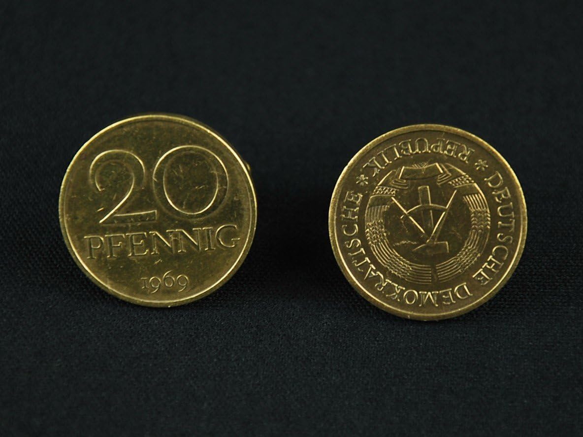 PRODUKTBESCHREIBUNGEN Manschettenknöpfe, hergestellt in Handarbeit und auffwendig poliert. Echte Münzen, 20 Pfennig, gold, als besonderer Hingucker. Mit Box zum Aufbewahren und verschenken. Material Knöpfe: Metall, 20 Pfennig Münzen (DDR) Grösse der Knöpfe: 22mm Lieferumfang: 1 Paar Manschettenknöpfe + Box Mehr