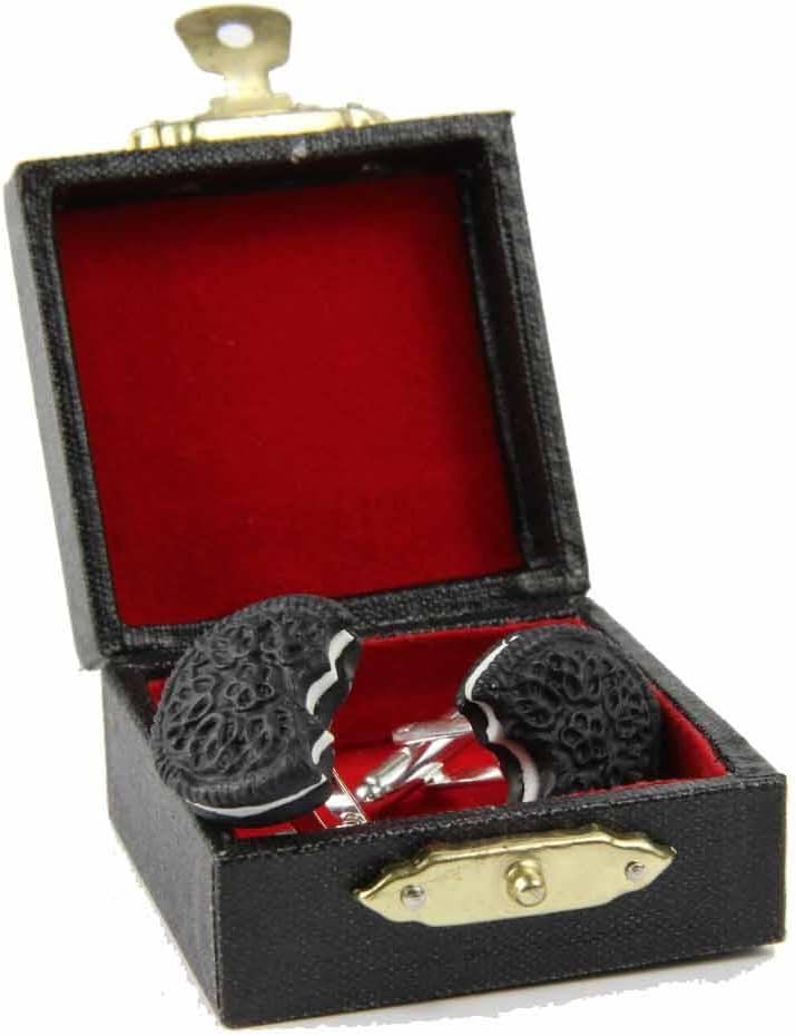 PRODUKTBESCHREIBUNGEN Manschettenknöpfe mit Doppelkeks, angebissen Die Knöpfe werden in einer schönen Holzbox geliefert. Material Knöpfe: Kunstharz Grösse der Knöpfe: 20mm Lieferumfang: 1 Paar Manschettenknöpfe + Box