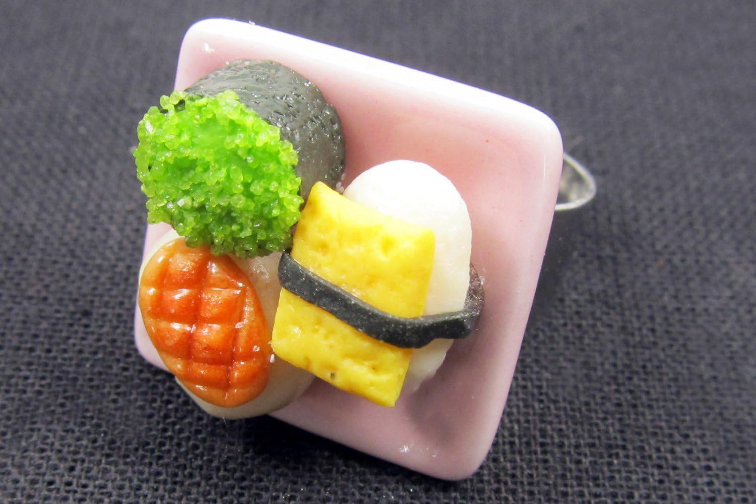 PRODUKTBESCHREIBUNGEN Sushi auf einem Porzellanteller, Miniatur auf einem Fingerring Das Design der einzelnen Sushis kann variieren (siehe Foto - und kann leider nicht ausgesucht werden). Echte Handarbeit: jedes Teil ist einzeln per Hand gegossen oder geformt! Material Motiv: Porzellan, Polymer Clay Ringgrösse: verstellbar Grösse des Motivs: 20mm Lieferumfang: 1 Ring