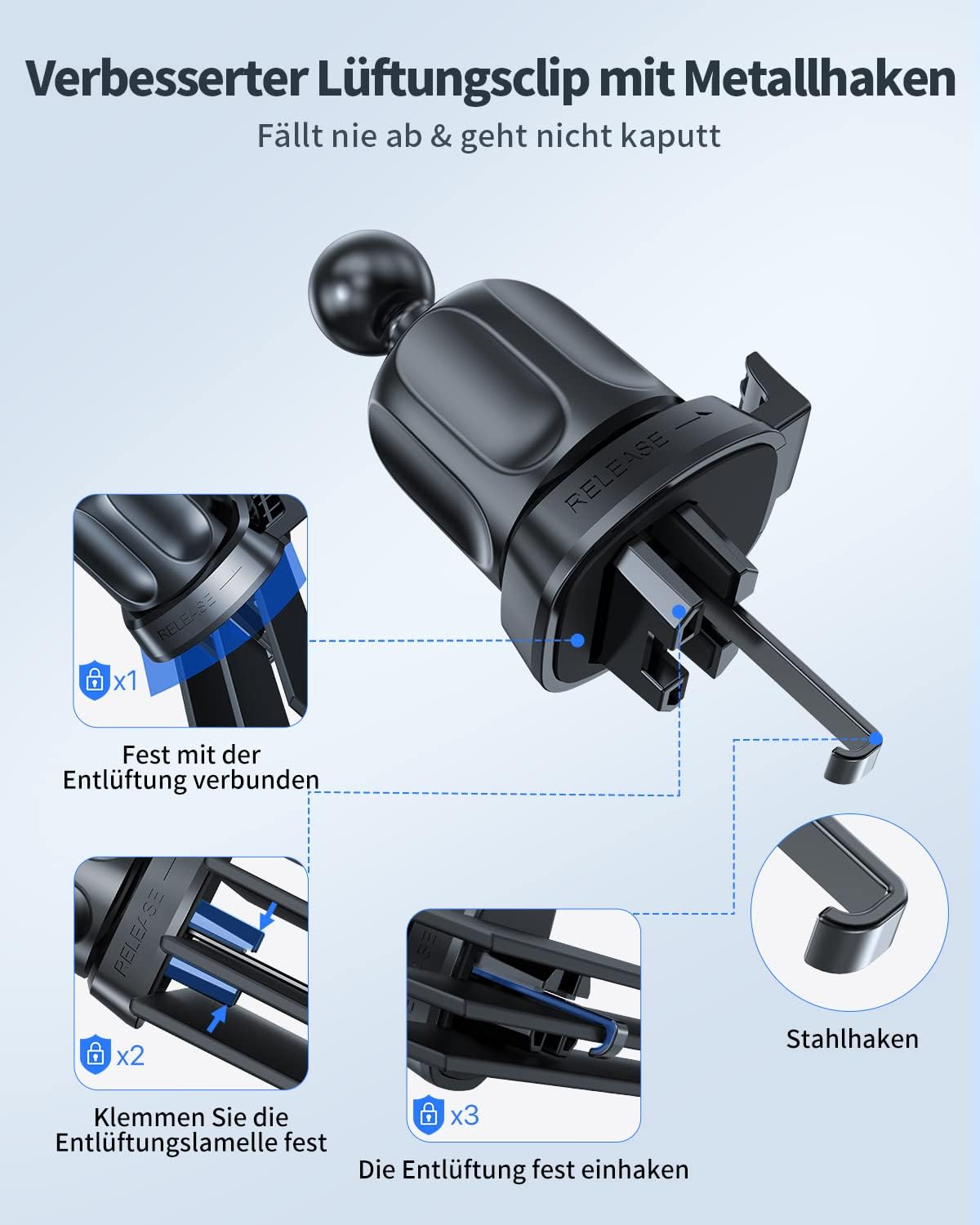 - ✅【Einzigartiges Design & Verbesserter Lüftungsclip】 Wir haben unsere Handyhalter aufgrund des Feedbacks von über 100.000 Kunden erheblich verbessert. Wir haben das Material des Häkchen auf Metall umgerüstet, um es viel stärker zu machen. Wir