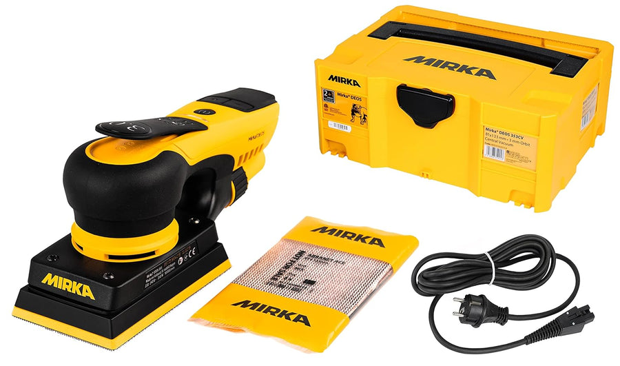 - Lieferumfang: Schwingschleifer, Schleifschuh (Schleifteller) Klett 81x133mm, Schutzauflage, 4.3m langes Elektrokabel, Mirka Transport-Box