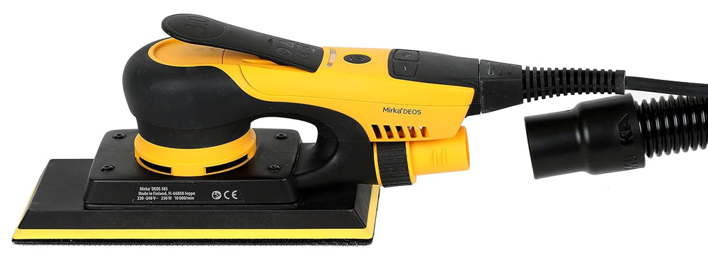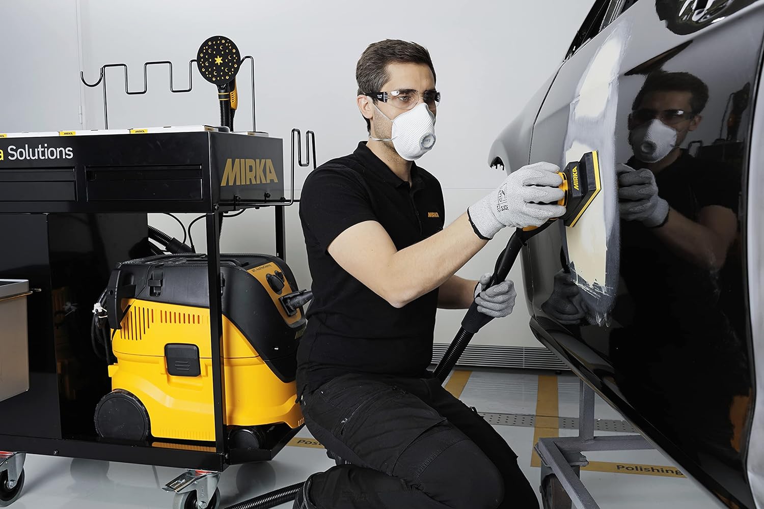 - Lass deine Gesundheit nicht schleifen: Der Mirka DEOS verfügt über eine Zentralabsaugung die in Kombination mit Netz-Schleifmitteln (z.B. Abranet), Absaugschlauch und Absaugung staubfreies Schleifen ermöglicht. Die elektrischen Mirka Schleifmaschinen
