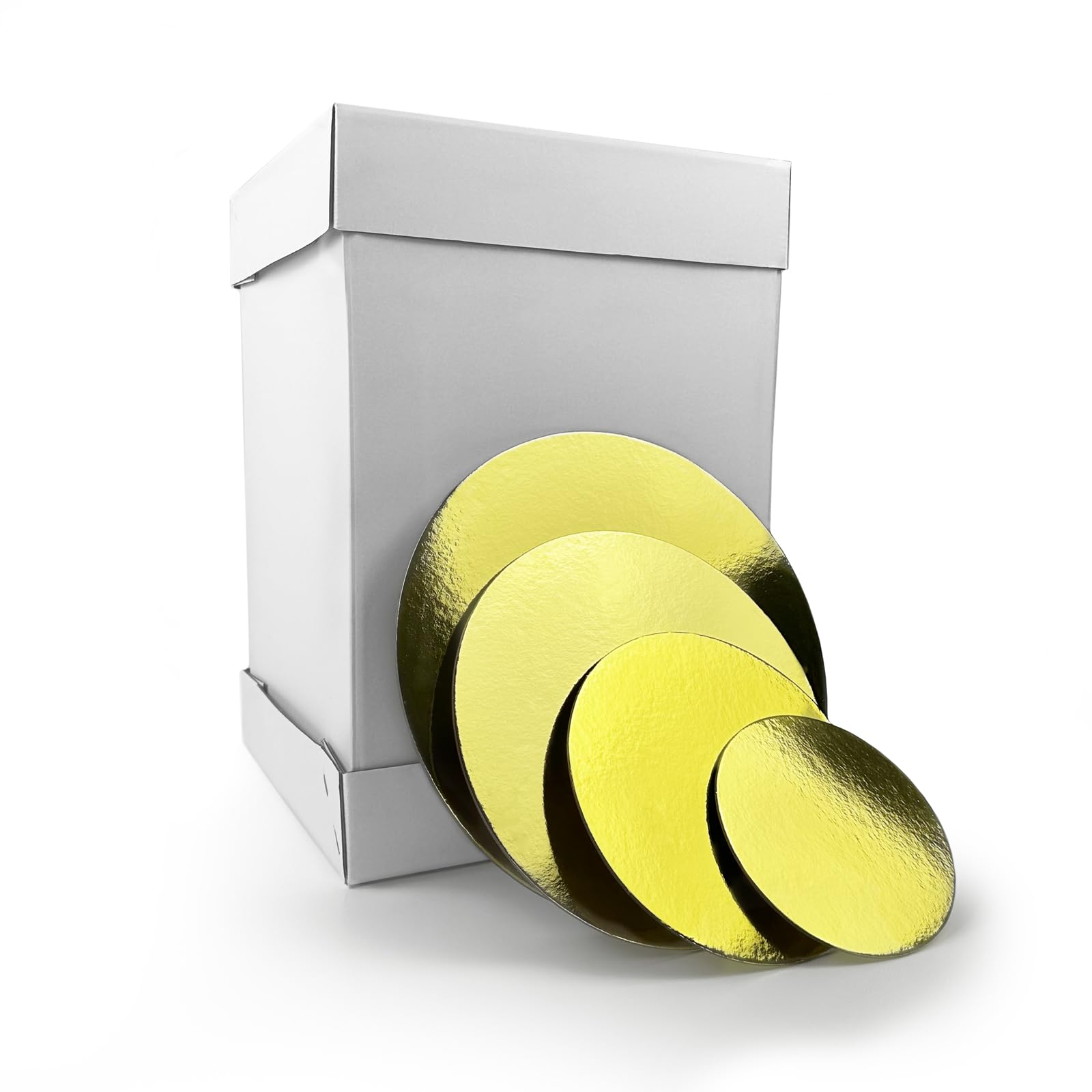 - 🎂 Lieferumfang: Du erhältst eine Tortenschachtel mit den Massen 30x30x45 cm und eine doppelseitige Kombination von 4 Cake Boards in Gold und Silber in verschiedenen Grössen (Ø 15, 20, 25 und 30 cm). Die Box besteht aus drei flach zusammengelegten