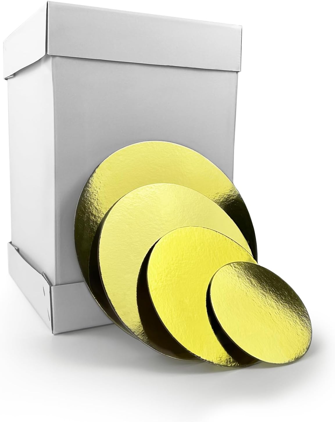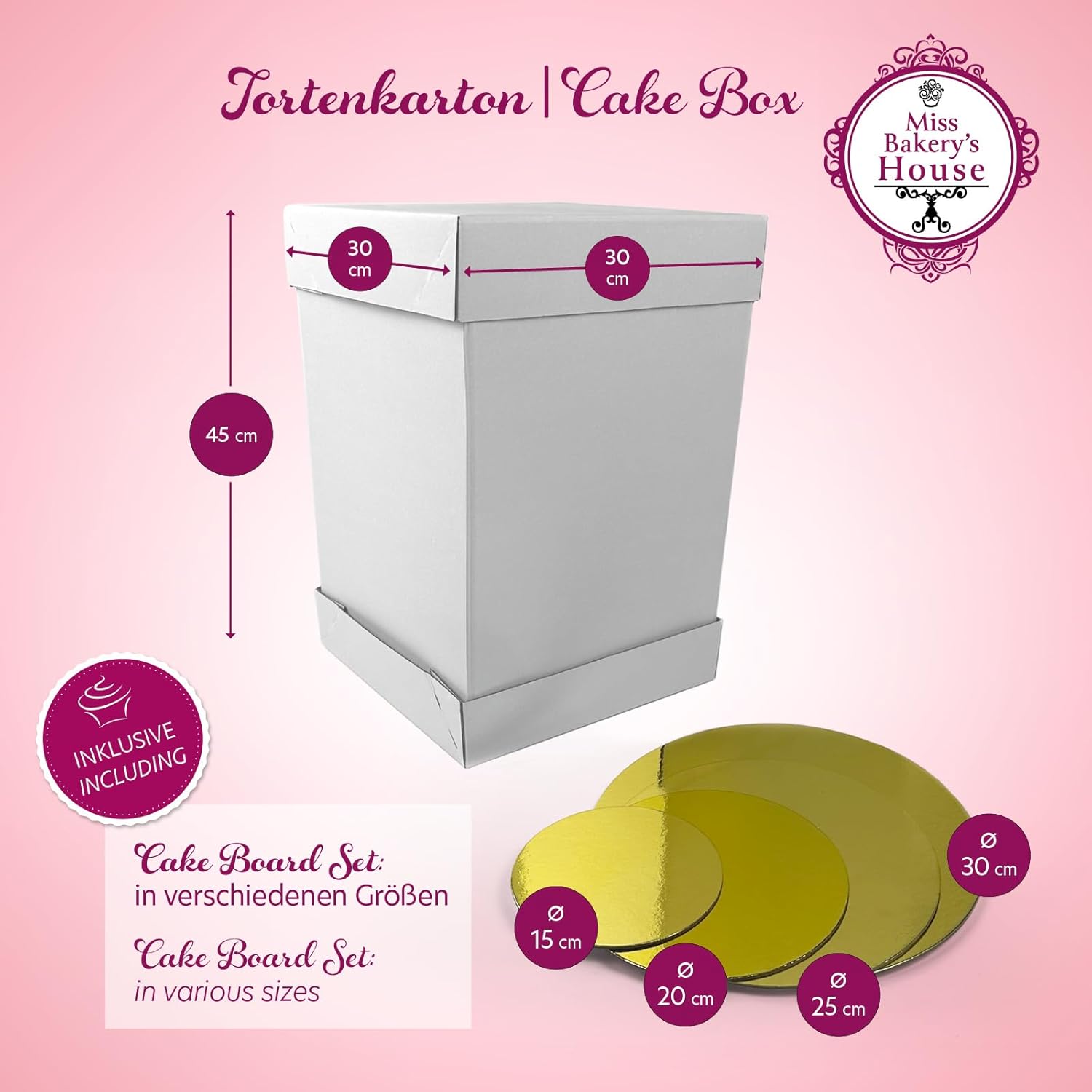 - 🎂 Lieferumfang: Du erhältst eine Tortenschachtel mit den Massen 30x30x45 cm und eine doppelseitige Kombination von 4 Cake Boards in Gold und Silber in verschiedenen Grössen (Ø 15, 20, 25 und 30 cm). Die Box besteht aus drei flach zusammengelegten