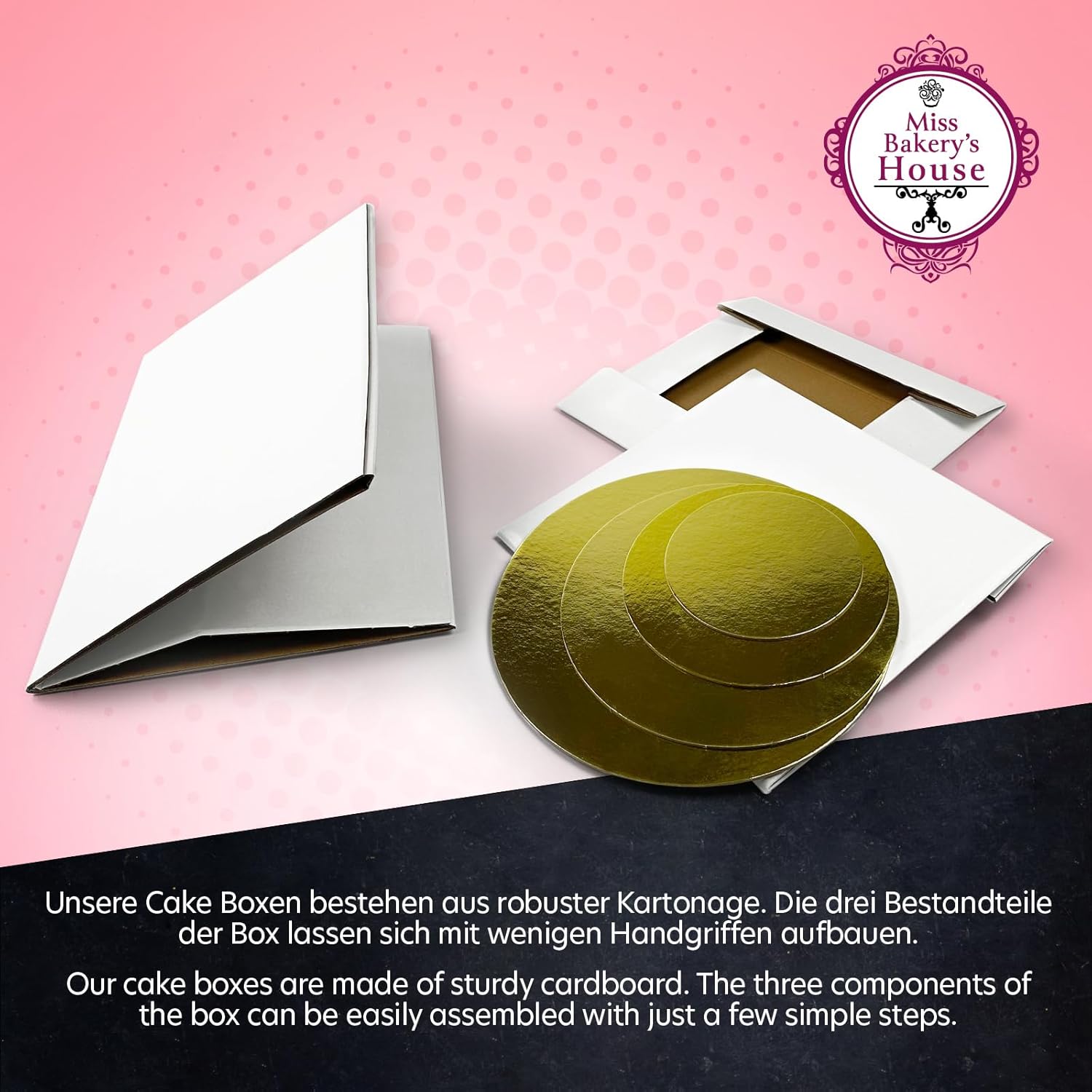 - 🎂 Ausgezeichnet verarbeitet: Unsere Cake Boxen bestehen aus robuster Kartonage. Die drei Bestandteile der Box lassen sich mit wenigen Handgriffen aufstellen. Ebenso einfach ist die Anwendung. Verwende bei der Herstellung deiner Torte die hochwertigen