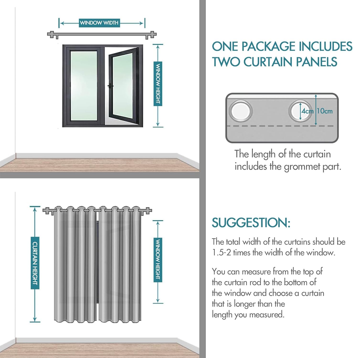• Bitte beachten Sie, dass unsere Vorhänge vor der Installation nach der flachen Breite für jeden Panel gemessen werden. Aufgrund des Aufhängens und Zusammenschiebens kann die tatsächliche Abdeckungsbreite geringer sein. Für eine optimale Abdeckung