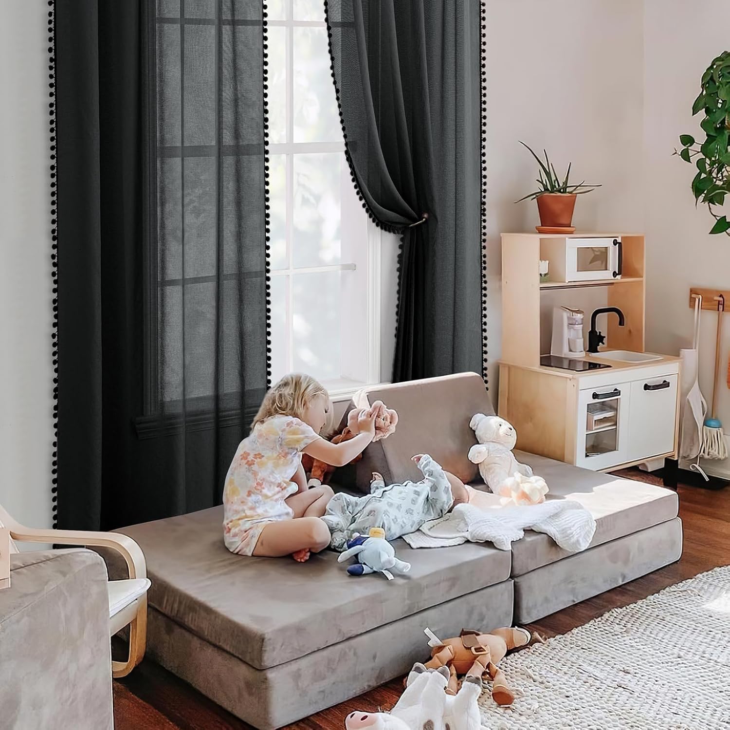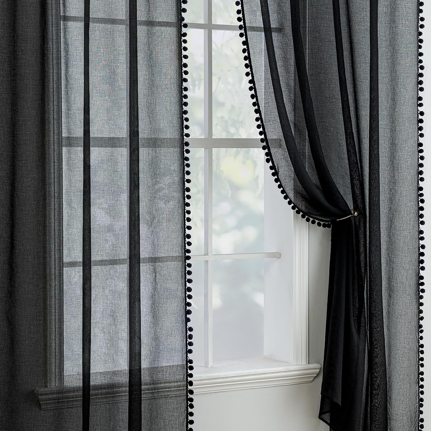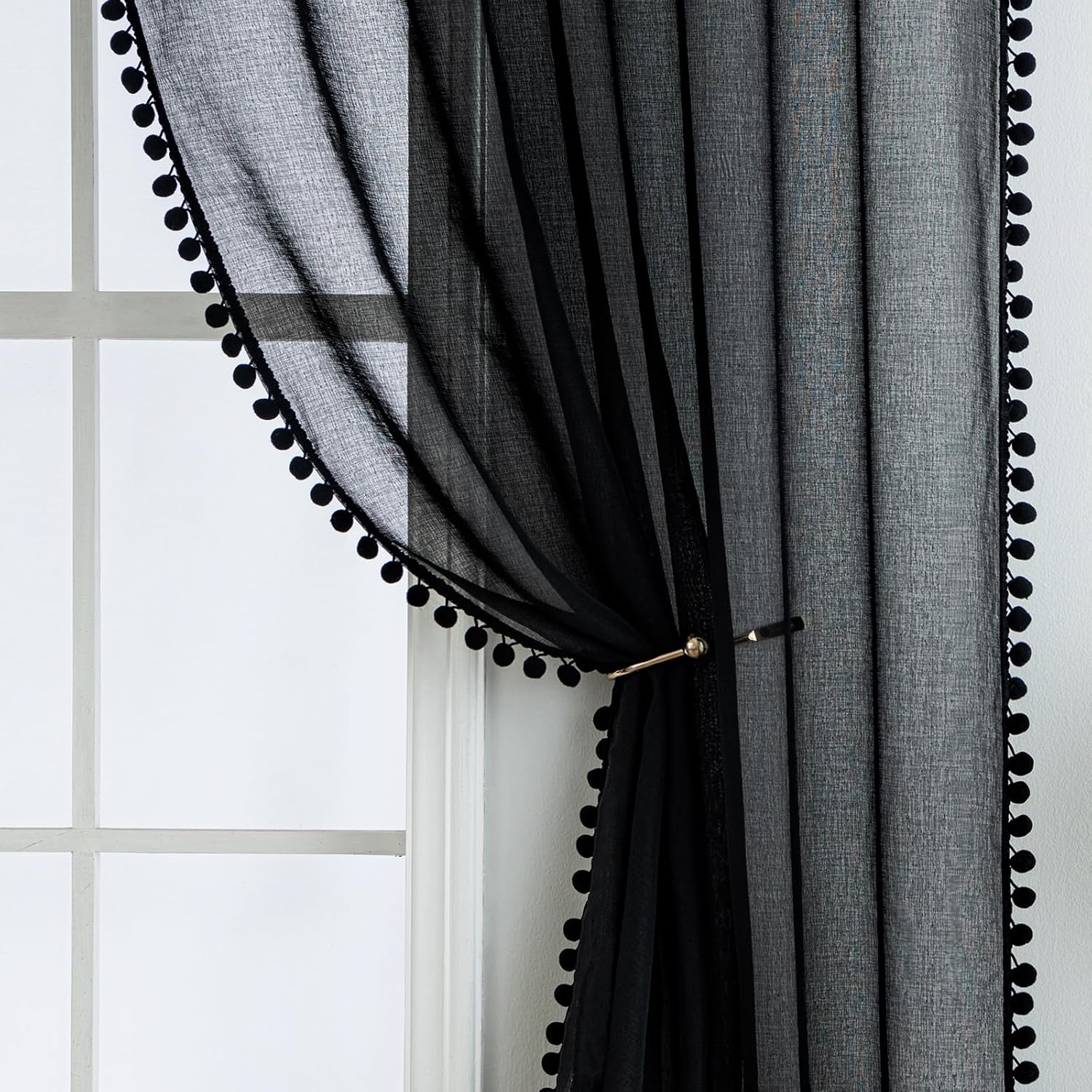 MIULEE Gardinen mit Pompons-Hübsche Schwarz Transparent Gardinen für Kinderzimmer Mädchen, 2 Stücke