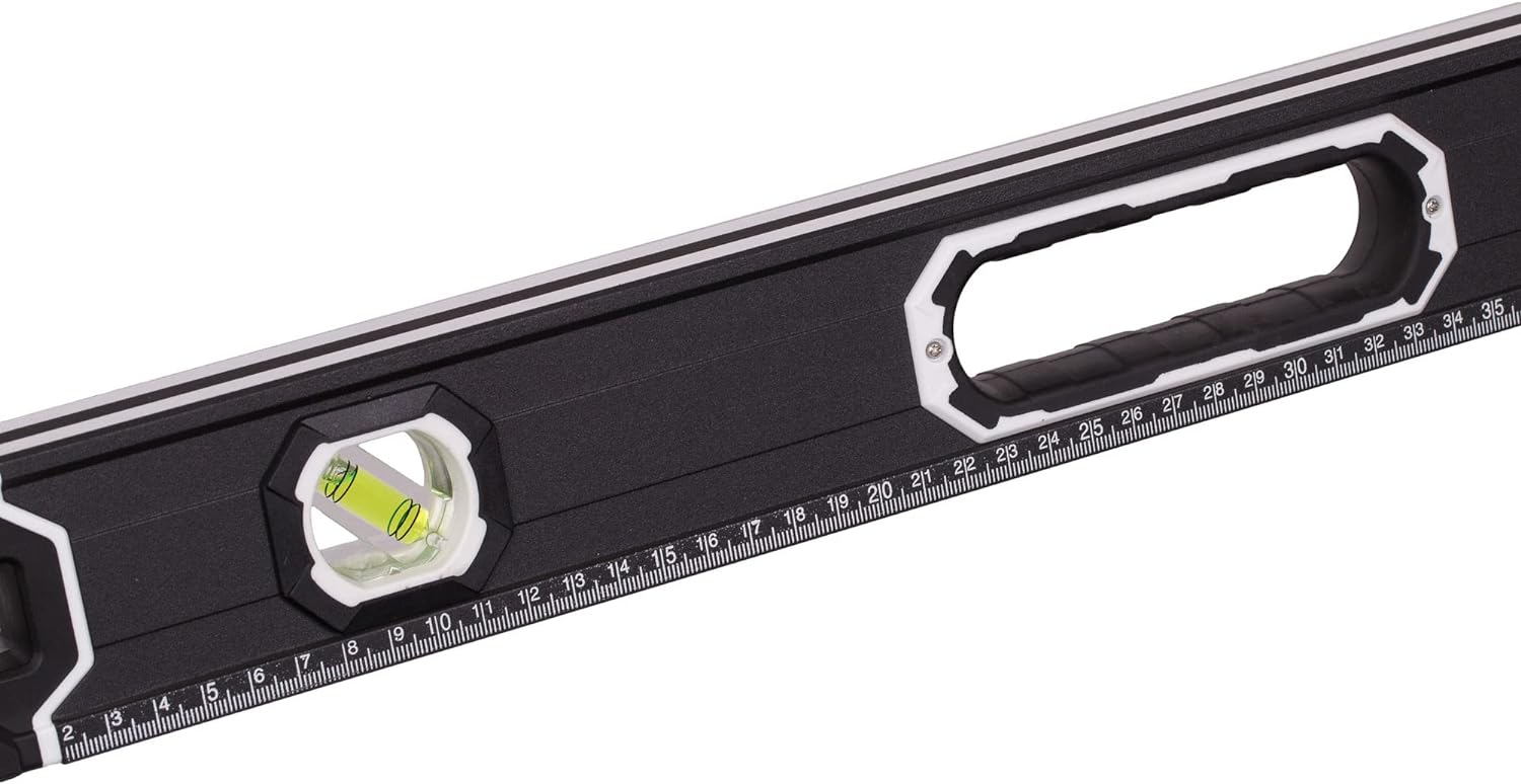 - ERGONOMISCH: Die Wasserwaage ist mit ergonomischen, rutschfesten Griffen ausgestattet, die einen sicheren Halt und Arbeitskomfort gewährleisten. Das beidseitige Massband ermöglicht Messungen von beiden Seiten des Werkzeugs, während die