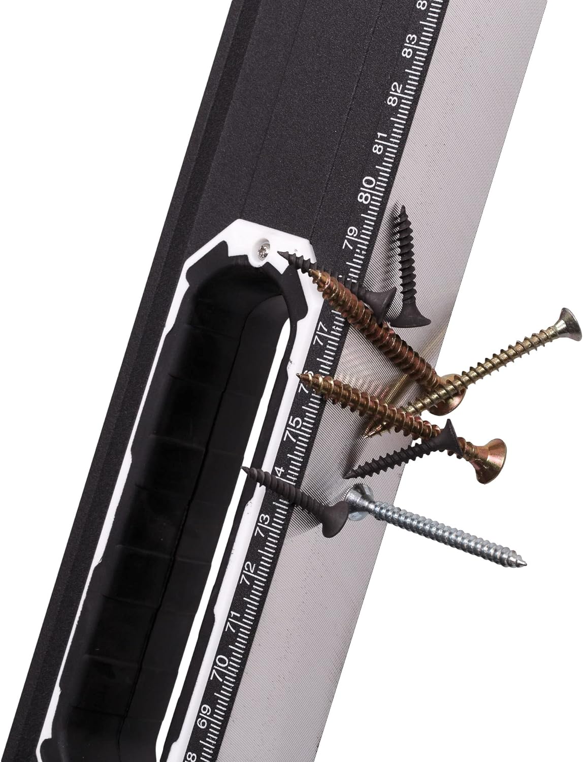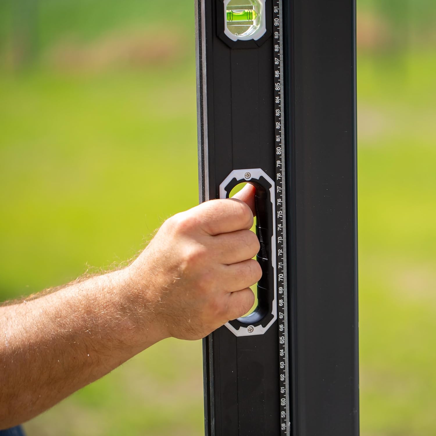 - ERGONOMISCH: Die Wasserwaage ist mit ergonomischen, rutschfesten Griffen ausgestattet, die einen sicheren Halt und Arbeitskomfort gewährleisten. Das beidseitige Massband ermöglicht Messungen von beiden Seiten des Werkzeugs, während die