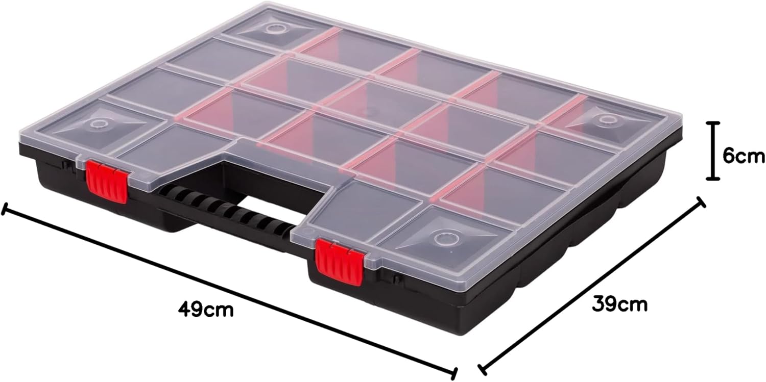 - ✅ Lieferumfang: 1 x Sortimentsbox mit 18 verstellbaren Fächern / Länge: 490 mm / Breite: 390 mm / Höhe: 65 mm / Gewicht: 1000 g