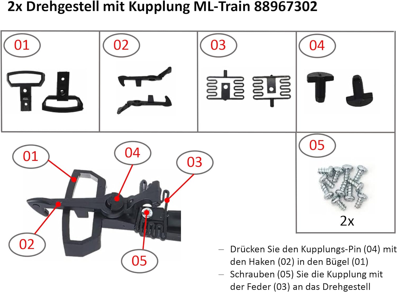 - UNMONTIERT: Das Set besteht aus Drehgestellträgern, Radsätzen, Kupplungsteilen und passenden Schrauben. Es wird in Einzelteilen als unmontierter Bausatz geliefert.
