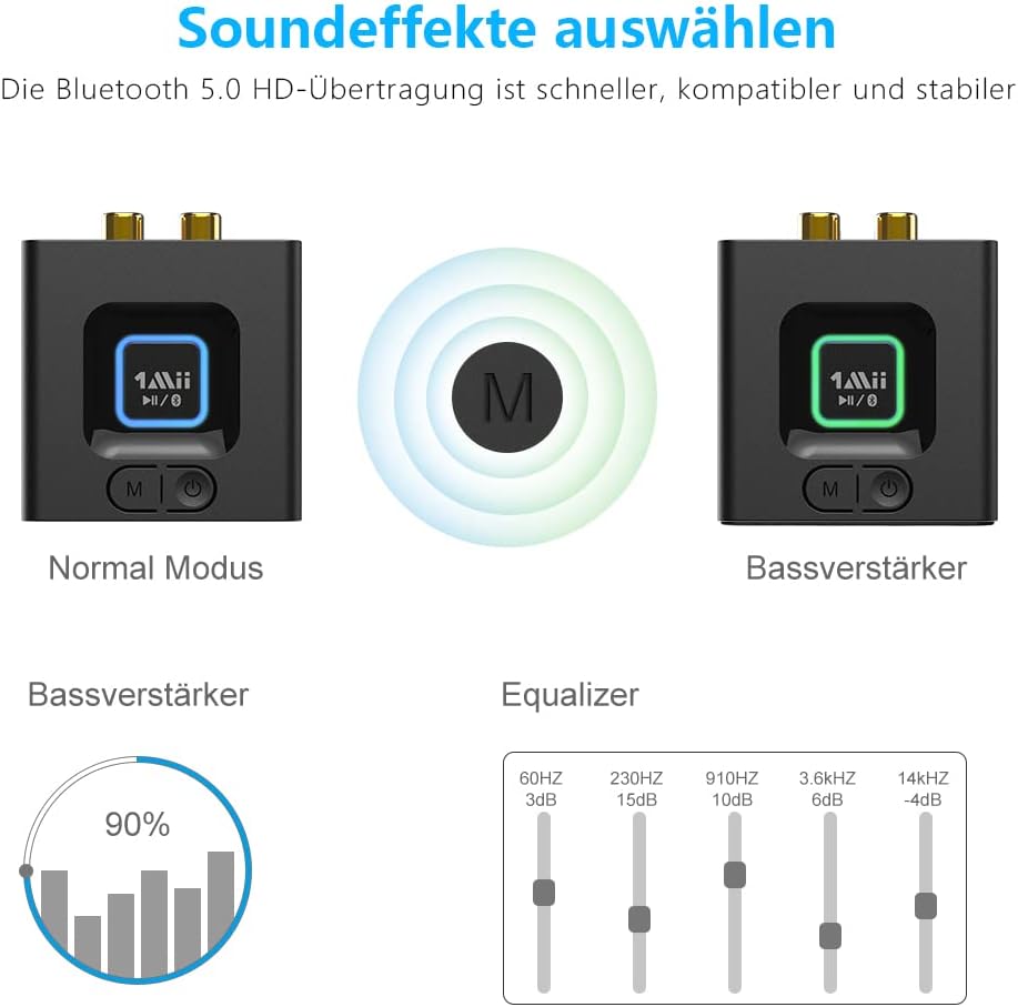 - 【High-Fidelity Sound mit Bass-Modus】Drücken Sie die „M“-Taste auf dem Bluetooth-Empfänger, um in den Bass-Modus zu wechseln, geniessen Sie das immersivere Hörerlebnis.