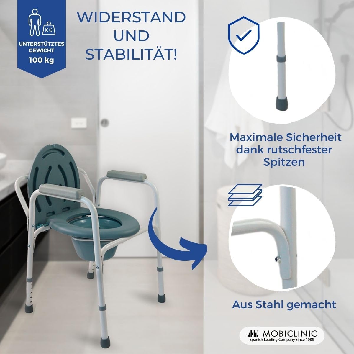 • ✔️SICHER: Die rutschfesten Füsse dieses WC-Stuhls bieten dem Benutzer mehr Sicherheit.