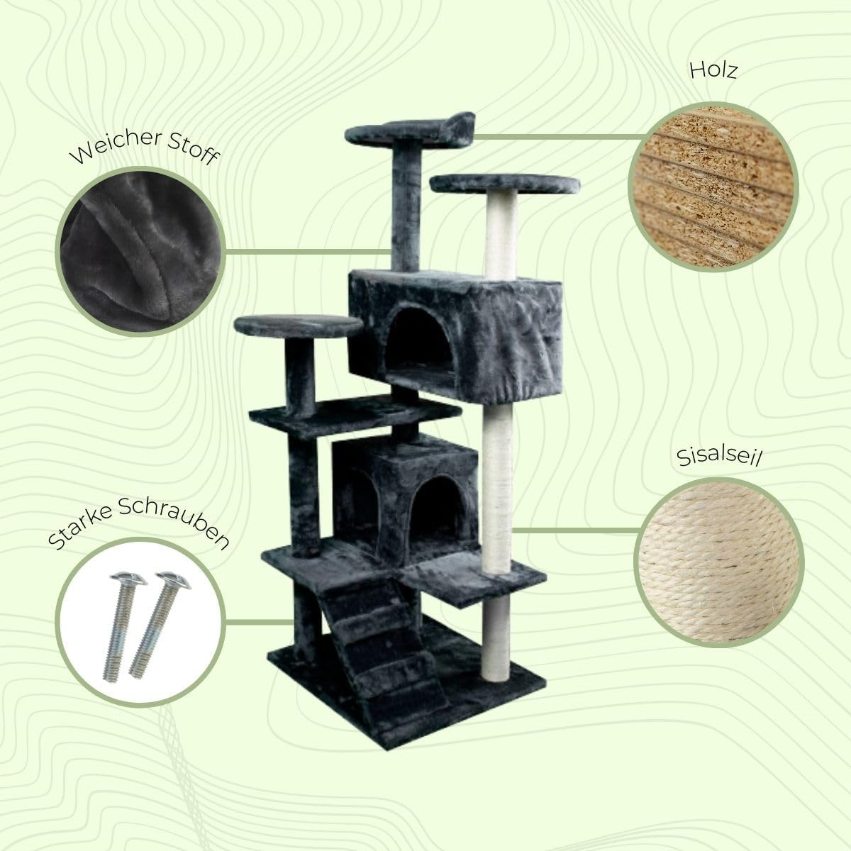 - 🐈PRODUKTDETAILS: Grösse: 50x50x132 cm. Sisalseil, weicher Stoff, Holzbretter Dunkelgraue Farbe. Gewicht: 13 kg.