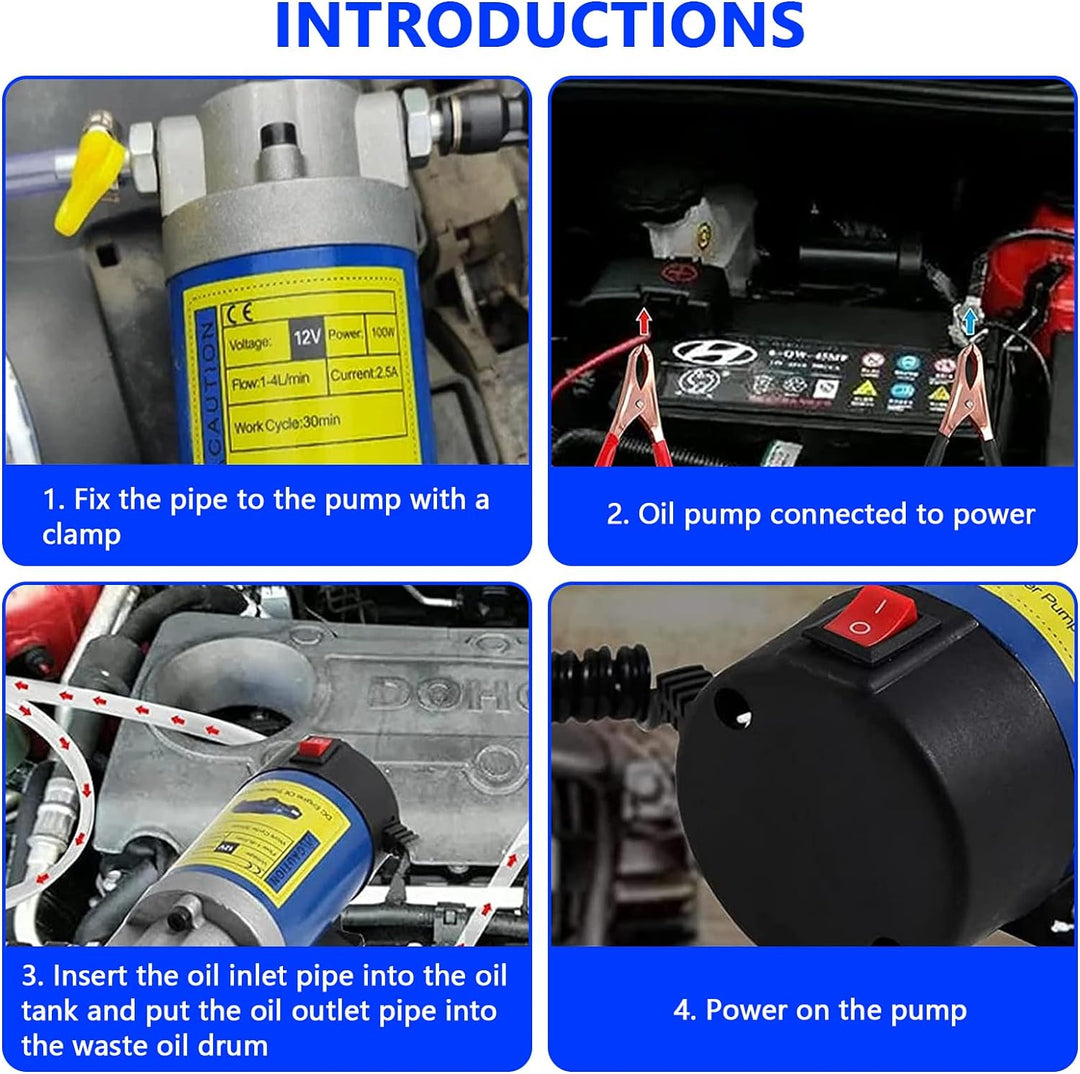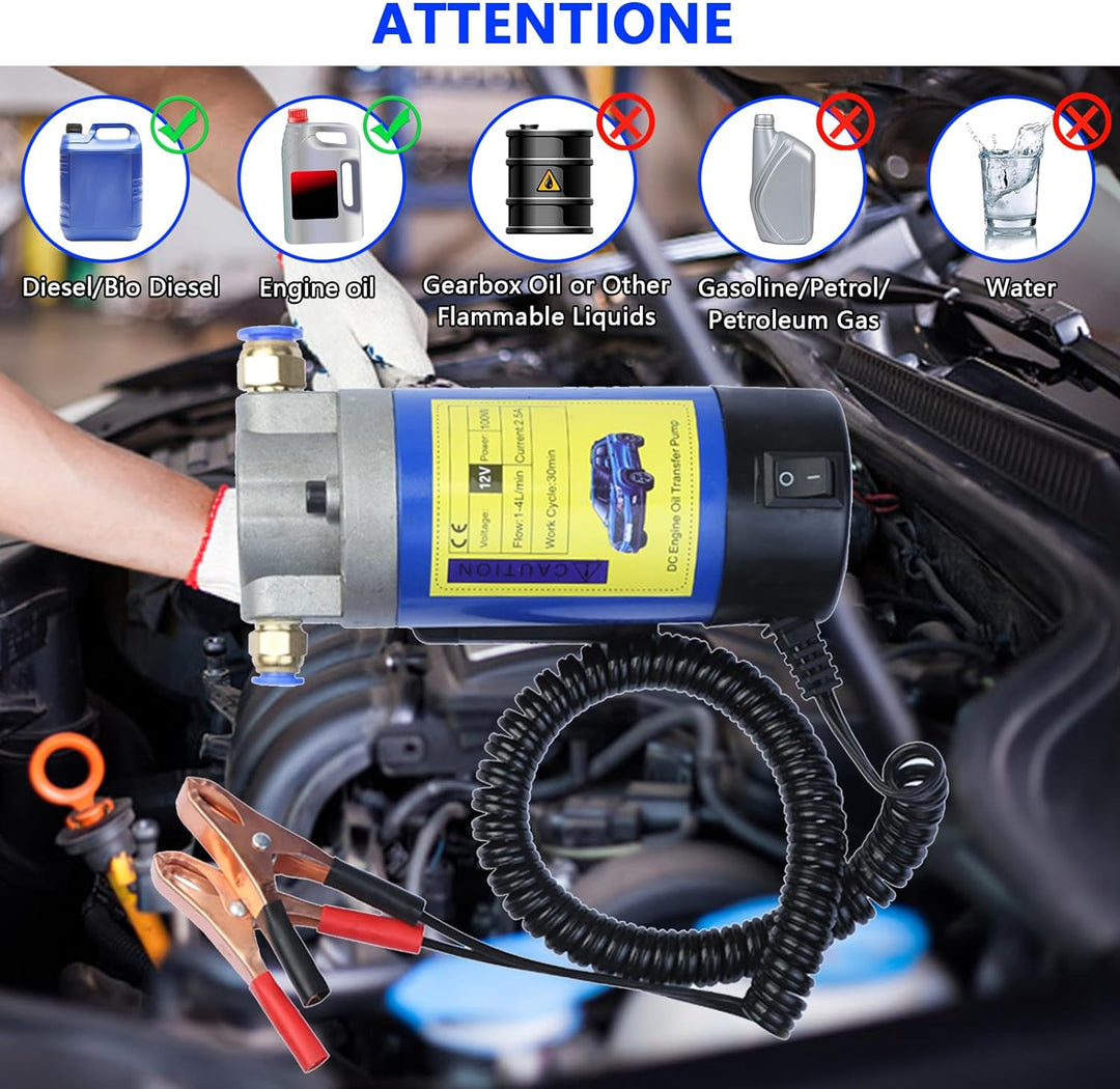 - 【Weit verbreitet】Lieferinhalt:1 x Ölpumpe, 1 x 0,8*100 cm Einlassschlauch, 1 x 0,6*100 cm Einlassschlauch,1 x 1*100 cm Auslassschlauch, 2 x Batterieklemmen, 1 x Schlauchschellen, 2 x pneumatische Anschlüsse. Geeignet für Autos, Motorräder, Boote