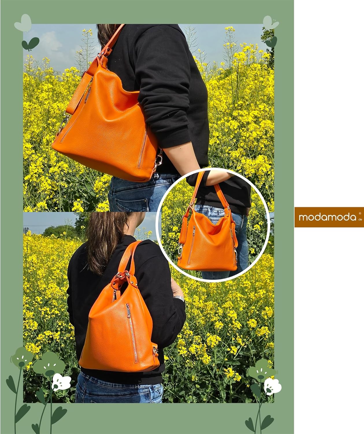 PRODUKTBESCHREIBUNGEN Ital. handgefertigte Damen Rucksack / Tasche 2in1 aus echtem Leder * NEU eingetroffen - Modisch-Sportliche Schultertasche in attraktiven Farben verwandelbar in einen praktischen Rucksack für unterwegs * durch das Lösen der Karabiner an der Taschenseite verlängern Sie die Gurte ausreichend lang um die Tasche als Schultertasche zu verwenden * passende Portemonnaie/Geldbörsen in vielen Farben unter der Bezeichnung modamoda P02 bis P11 erhältlich * passende Hüfttaschen in 2 Grössen ebenfalls in vielen Farben unter der Bezeichnung modamoda T77 + T211 erhältlich * das geräumige Hauptfach ist mit einem Reissverschlussfach sowie 2 Steckfächern ausgestattet - auf der Vorderseite befinden sich 2 Aussenfächer mit Reissverschluss - auf der Rückseite ist ein Sicherheitsfach mit Reissverschluss angebracht - alle Fächer sind zur Unterbringung Ihres Smartphones geeignet - textiles Innenmaterial - verstärkter Boden - Metallteile silberfarben ! Weitere Rucksäcke unter der Bezeichnung modamoda T233, T138, T141,T161, T175, T235 sowie T192 ! Aussenmasse der Tasche ca.: Länge = 30,0 cm (am Boden gemessen) 28 cm (am Oberrand gemessen) Breite = 13 cm (am Boden gemessen) Höhe = 29 cm Gurtlänge in Rucksackfunktion verstellbar von ca. 45 - 80 cm je Gurt (inkl. Karabiner gemessen) Gurtlänge in Schultertaschenfunktion verstellbar von 46 - 75 cm Gewicht ca.: 0,750 kg modamoda de ist eine eingetragene Marke. Paybackkarte dient lediglich dem Grössenvergleich Der Farbton kann bedingt durch unterschiedliche Darstellungen und Farbauflösungen bzw. Monitor-Einstellungen mit der Abbildung vom Original abweichen! Eine korrekte, genaue Darstellung der Farbtöne ist über das Internet nicht möglich.