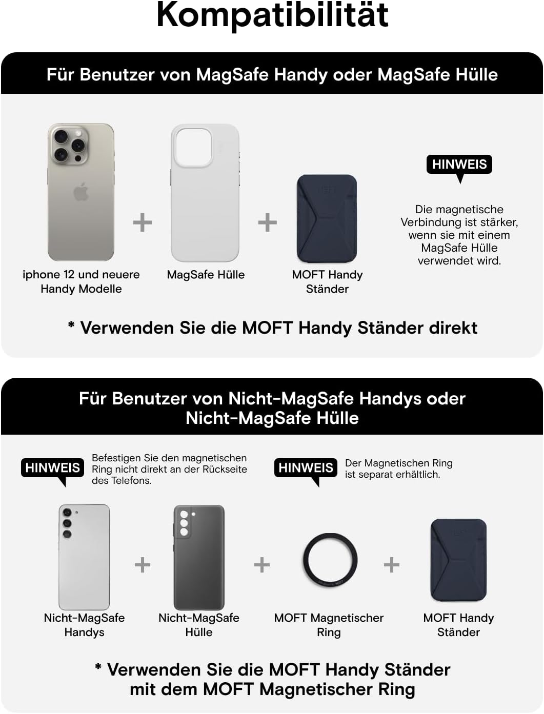 - MagSafe-Kompatibilität: Der Ständer funktioniert gut mit der iPhone 14, 13 und iPhone 12 Serie, einschliesslich iPhone 12/mini/Pro/Pro Max und iPhone 13/mini/Pro Max. Er kann auch an den Magsafe-Hüllen und unseren MOFT-Hüllen befestigt werden,