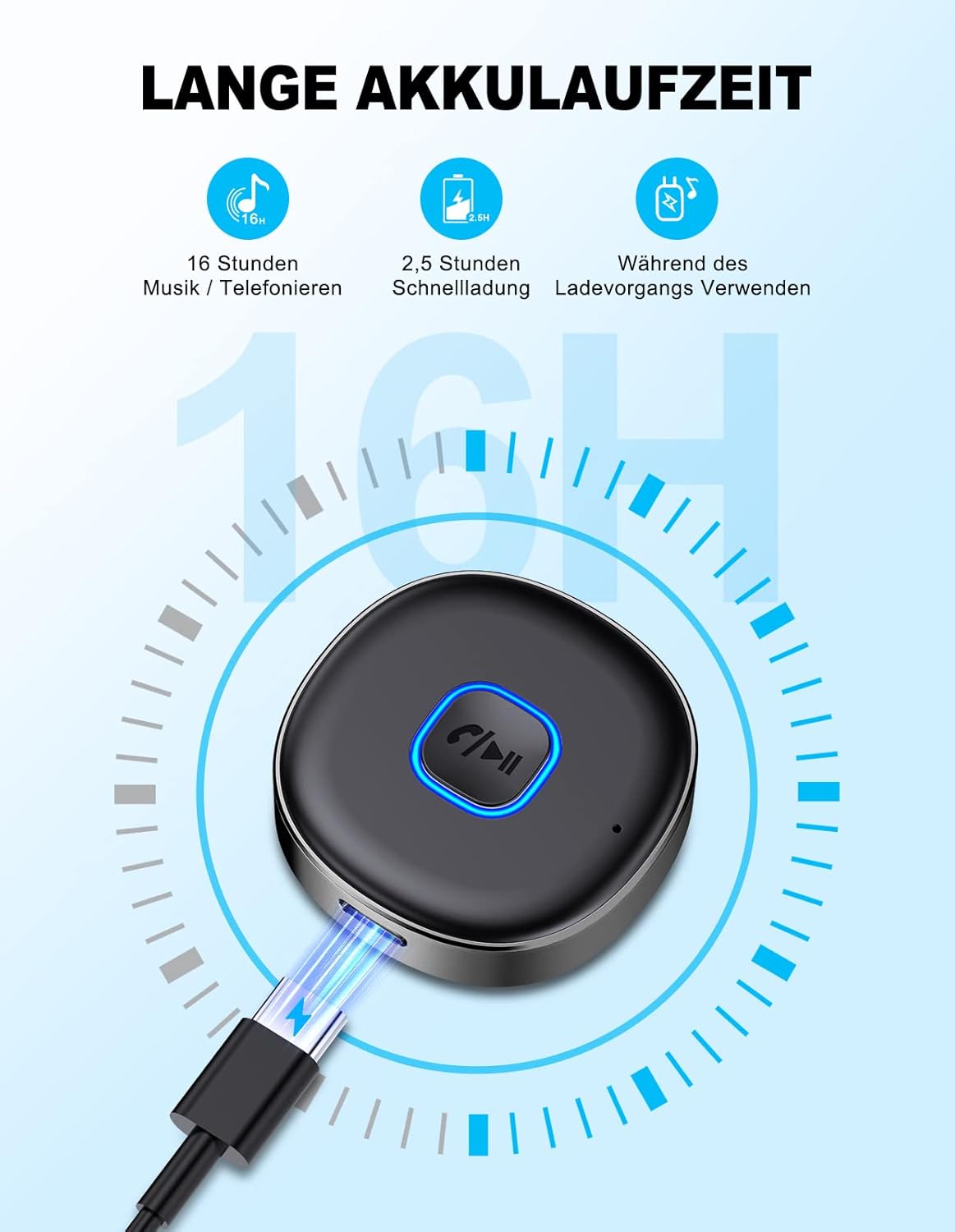 - 【Lange Akkulaufzeit & Typ-C-Aufladung】Dieser Bluetooth empfänger AUX funktioniert bei normalem Gebrauch bis zu 16 Stunden lang. Und mit dem mitgelieferten Typ-C-Schnellladekabel lässt es sich in nur 2,5 Stunden vollständig aufladen. Noch