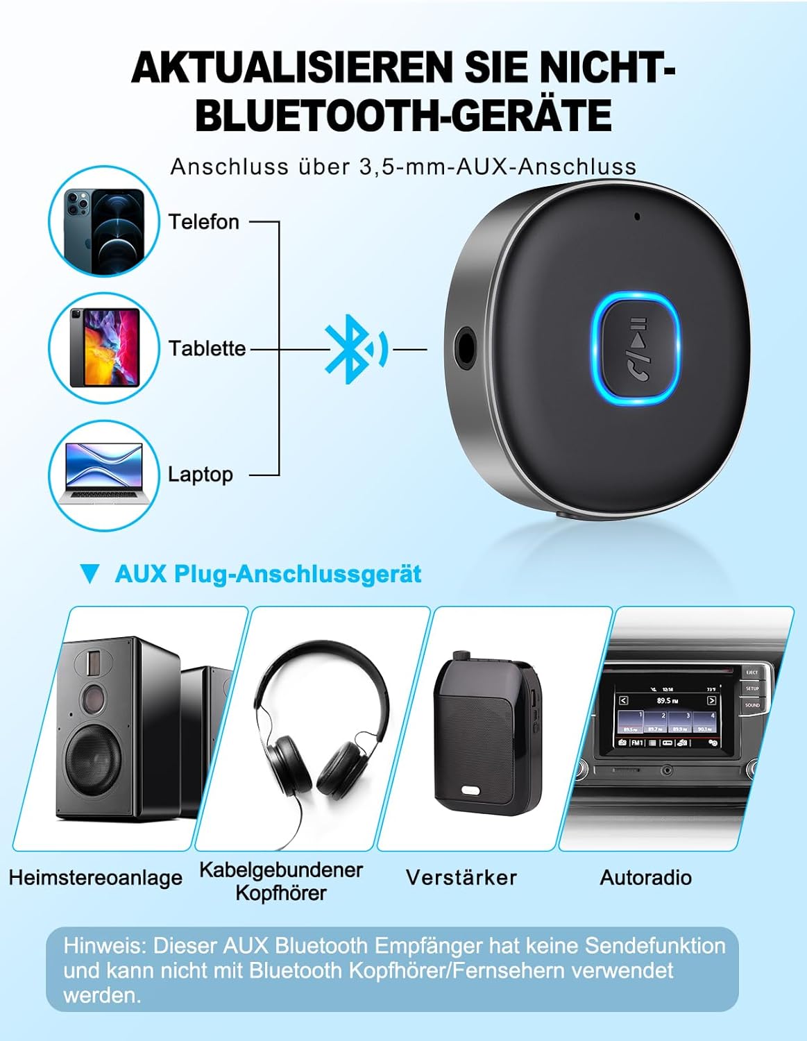 - 【Bluetooth 5.3 & Doppel-Verbindung】Der verbesserte Bluetooth 5.3-Chip ist für eine stabile Verbindung und schnelle Übertragung ausgestattet. Der AUX Bluetooth adapter ist mit den meisten Bluetooth-Geräten wie iPhone, Android-Smartphone, iPad,