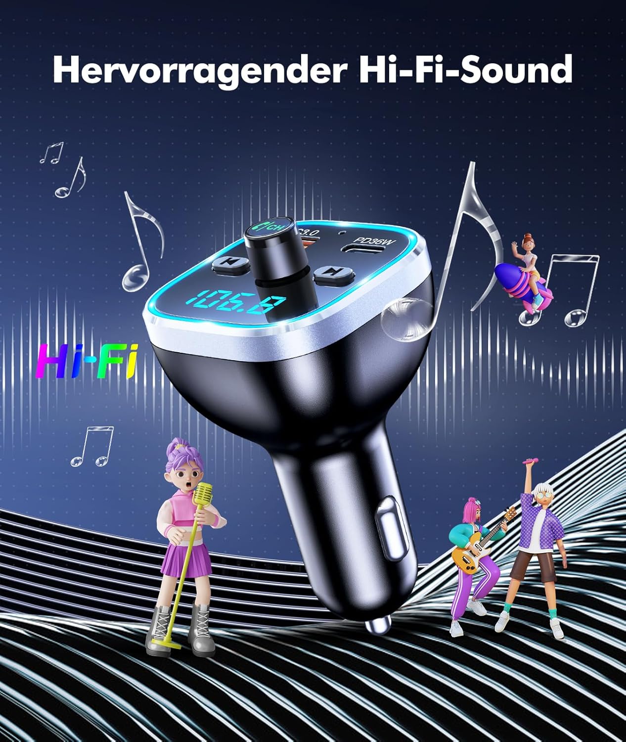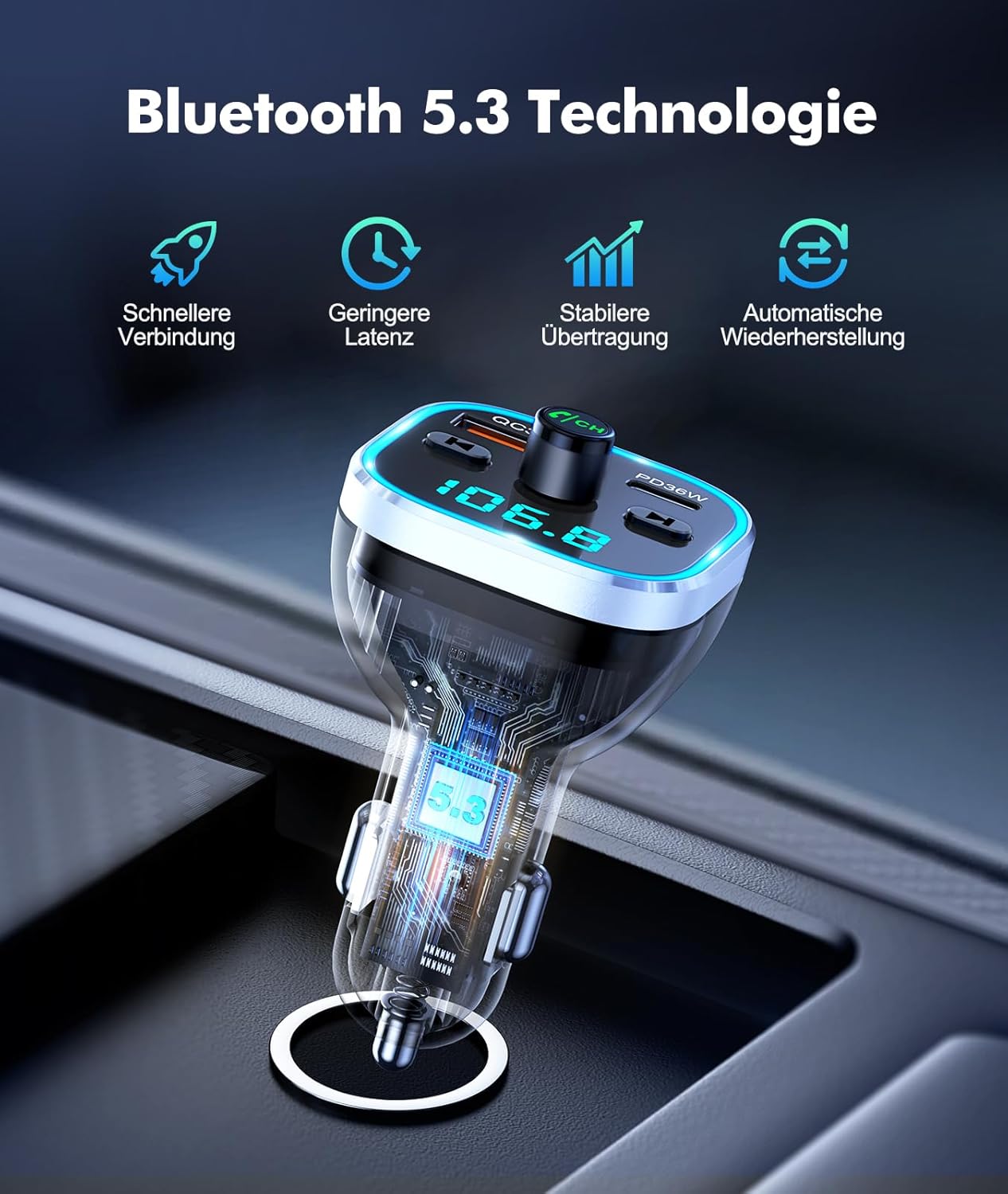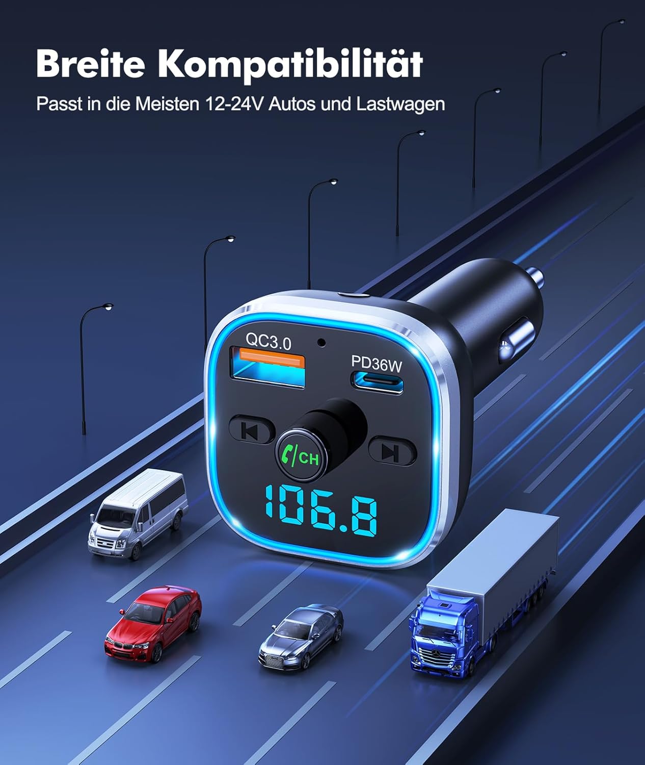 - 54W Superschnellladen: Der Transmitter für Auto Bluetooth kombiniert PD 36W und QC3.0 18W in Dual-USB-Anschlüssen, was gleichzeitiges Schnellladen für zwei Geräte ermöglicht. Das iPhone 16 kann innerhalb einer halben Stunde 70 % Ladung erreichen und