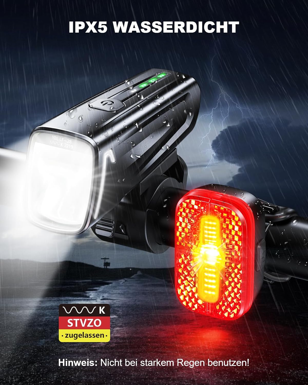 • Hochgradig Hell & Einfache Modi: Durch den Einsatz modernster Lampenperlen strahlen unsere Fahrrad Licht eine blendende Helligkeit von 60/35Lux aus. Das Fahrradlampe Vorne verfügt über 2 Modi (hoch und niedrig), das Rücklicht Fahrrad bietet einen