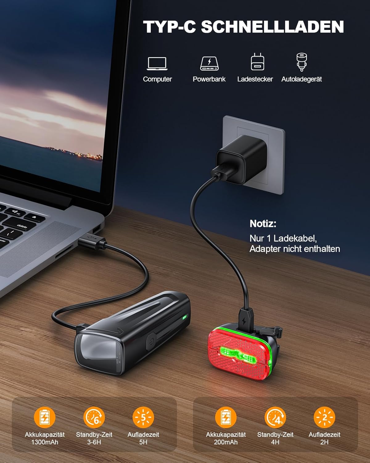 • USB-Laden & Lange Laufzeit: Unsere wieder aufladbaren Fahrradlampe sind mit einem 1300mAh-Akku für das LED Fahrradlicht Vorne und einem 200mAh-Akku für das Fahrrad Rücklicht ausgestattet. Im "Niedrig Licht" Modus bietet der Scheinwerfer eine