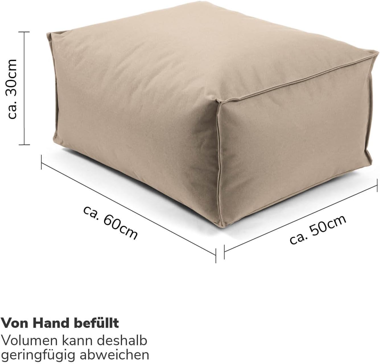 • FÜR DRINNEN & DRAUSSEN! Unser eckiger Sitzpouf ist dein Begleiter für gemütliche Stunden unter freiem Himmel und relaxte Momente Zuhause. Trotz wasserabweisendem Stoff sollte er jedoch nicht permanent auf nassem Grund oder in der Sonne stehen.