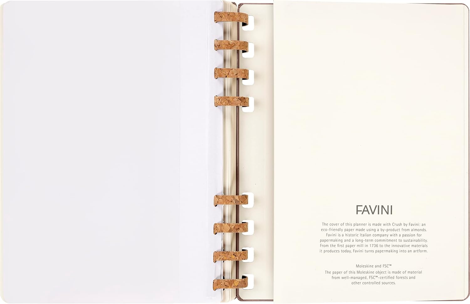 - Made in Italy: 15 Prozent des Einbands wird aus Mandelabfällen hergestellt. Das seit 1736 bestehende norditalienische Unternehmen Favini ist weltweit führender Hersteller von natürlichen Materialien auf Faserbasis