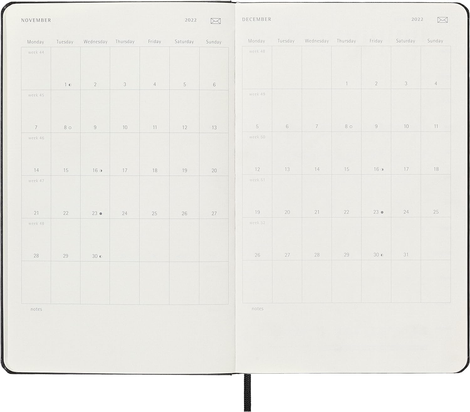 - Der Moleskine Planer hat ein Wochenlayout von 12 Monaten, von Januar bis Dezember, mit stündlichen und täglichen Abschnitten, in denen Projekte und Aktivitäten für den Monat festgelegt werden können