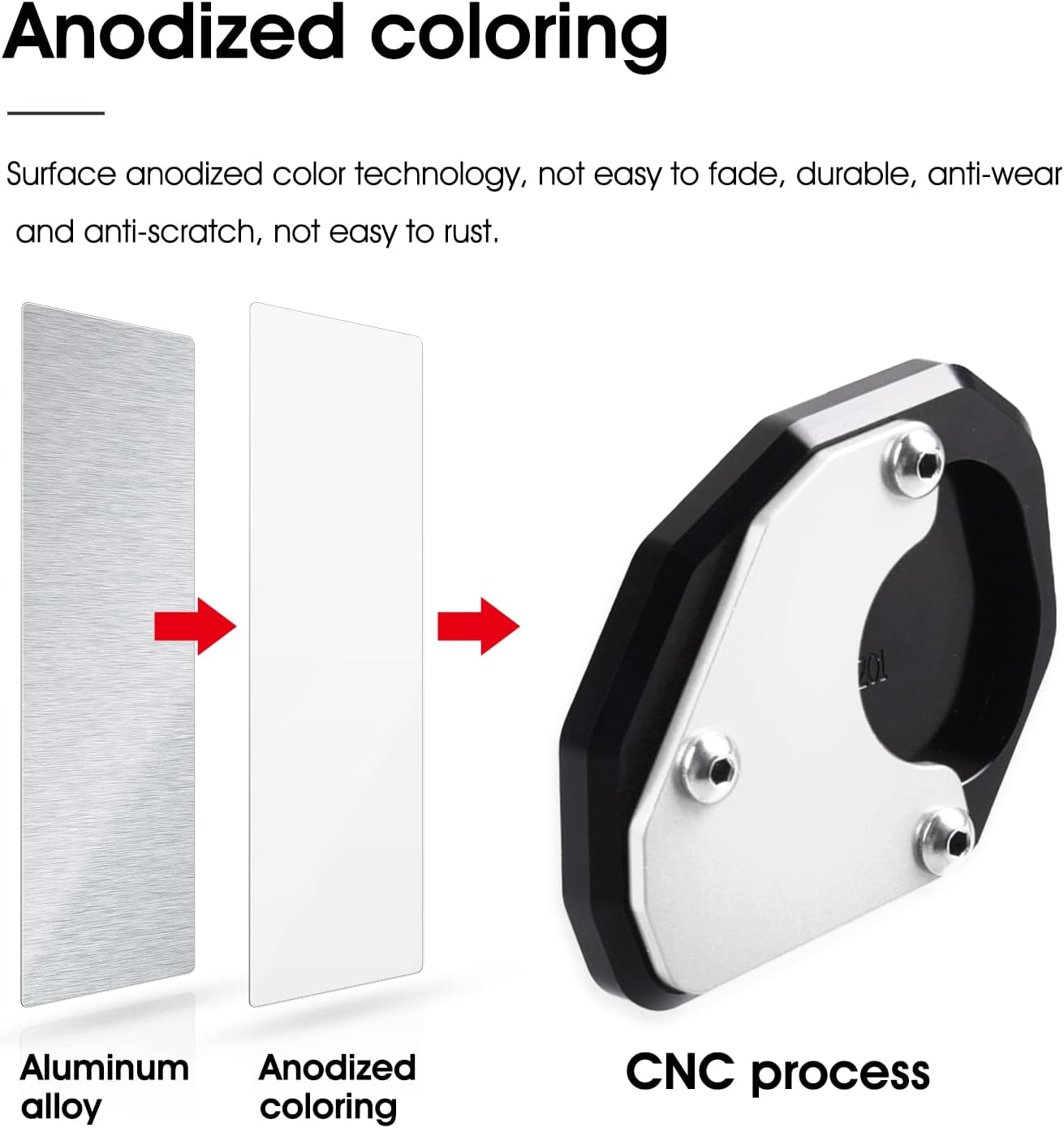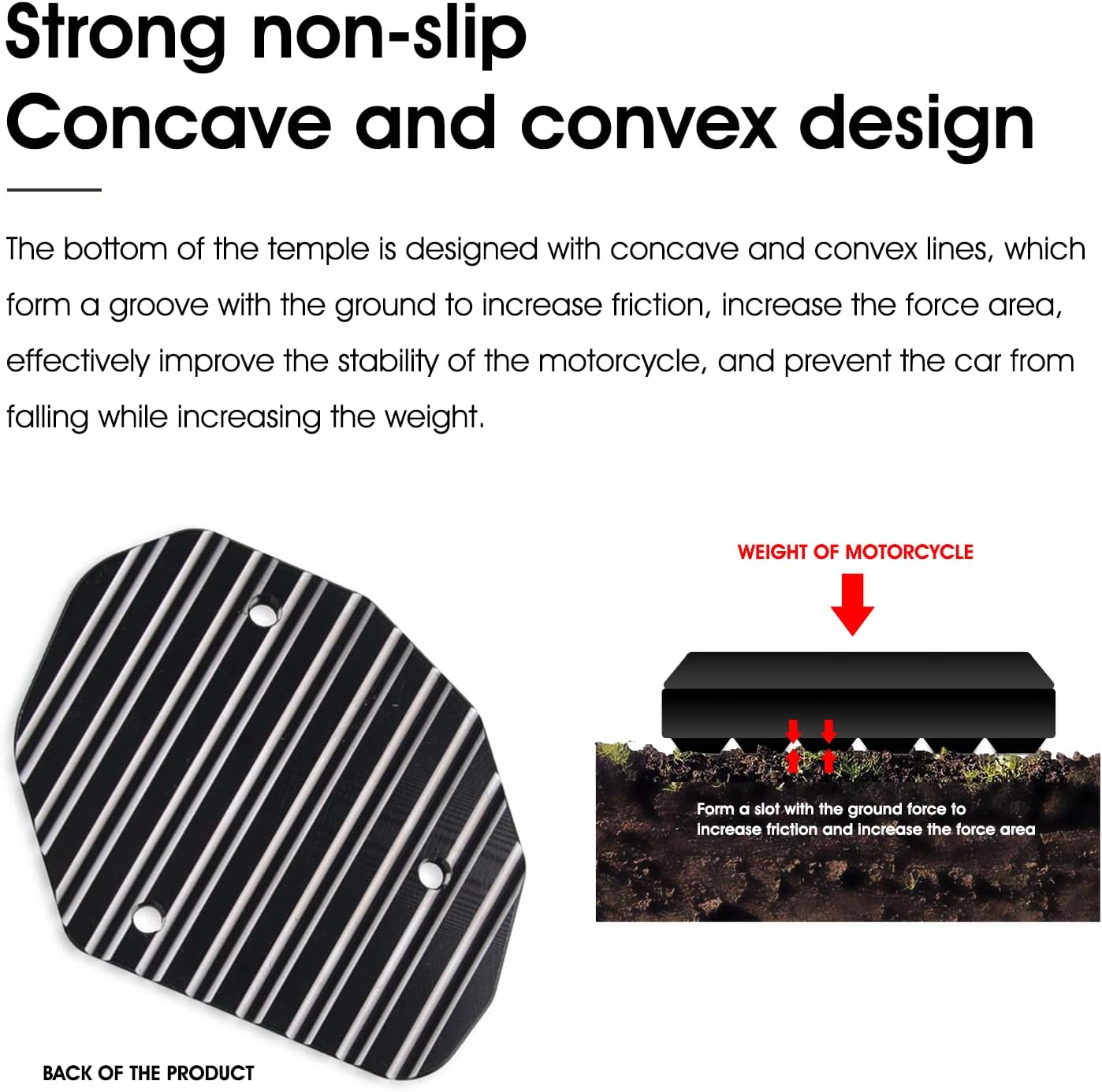 - 【Stabil】 Der breite Seitenständerfuss stabilisiert Ihr Motorrad, wenn es auf dem Seitenständer geparkt ist. Egal ob Sie auf Gras, Kies, Schlamm oder Waldboden abstellen möchten, die grössere Fussfläche des Seitenständers verbessert die