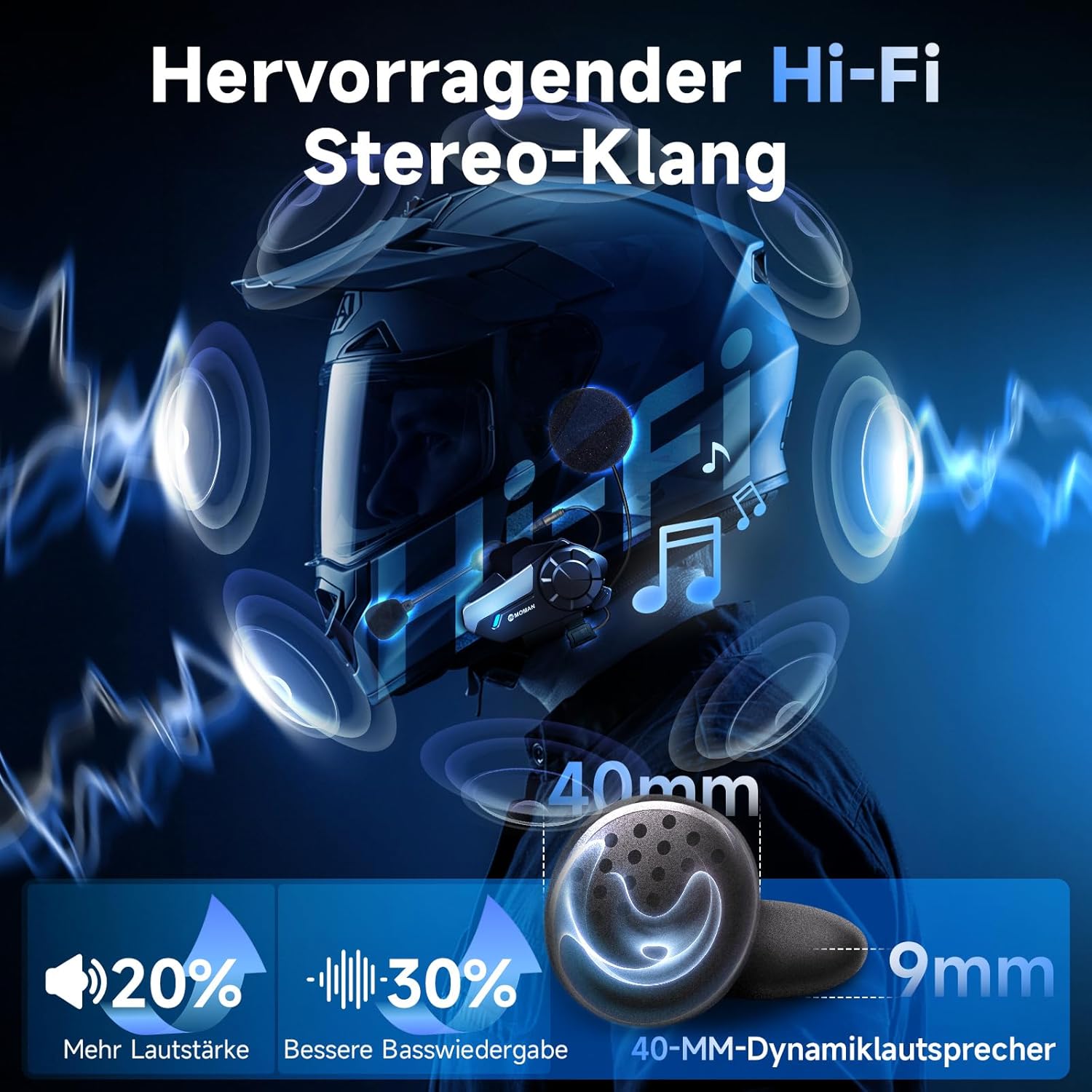- 【Hi-Fi Stereo & Triple Geräuschunterdrückung】Mit H2 Pro Motorrad Intercom Headset tauchen Sie in eine beeindruckende Klangumgebung ein. Der fortschrittliche Stereo-Effekt schafft eine realistische Atmosphäre, während der 40mm HiFi-Lautsprecher