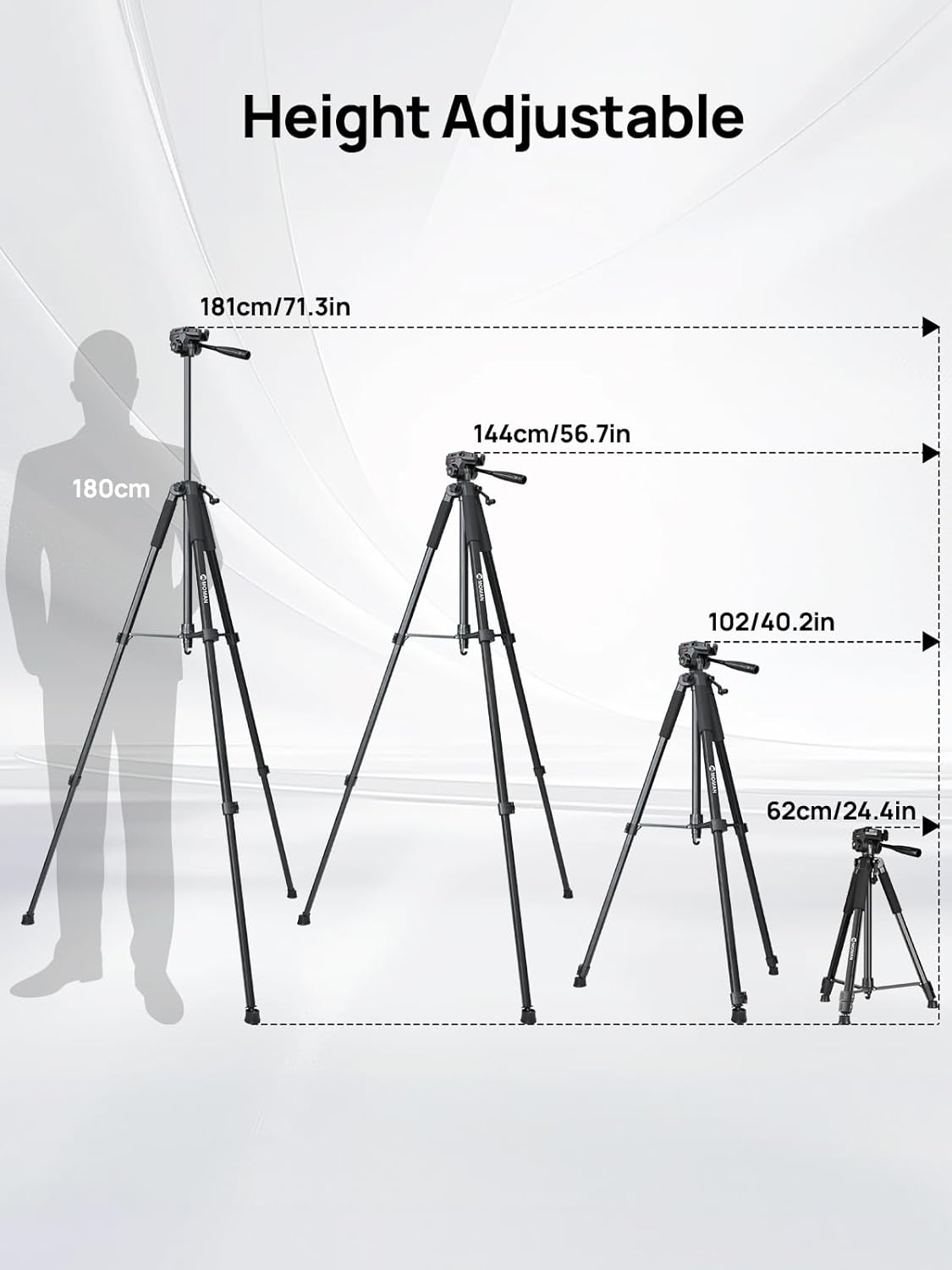 • 【Leichtes und tragbares Reisestativ】Das Moman TP71T Stativ wiegt nur 2kg, misst 64 cm und lässt sich auf 143cm ausziehen. Die Höhe kann durch Schwenken der Kurbel auf 180cm erhöht werden. Dieses robuste, tragbare Stativ aus leichtem Aluminium