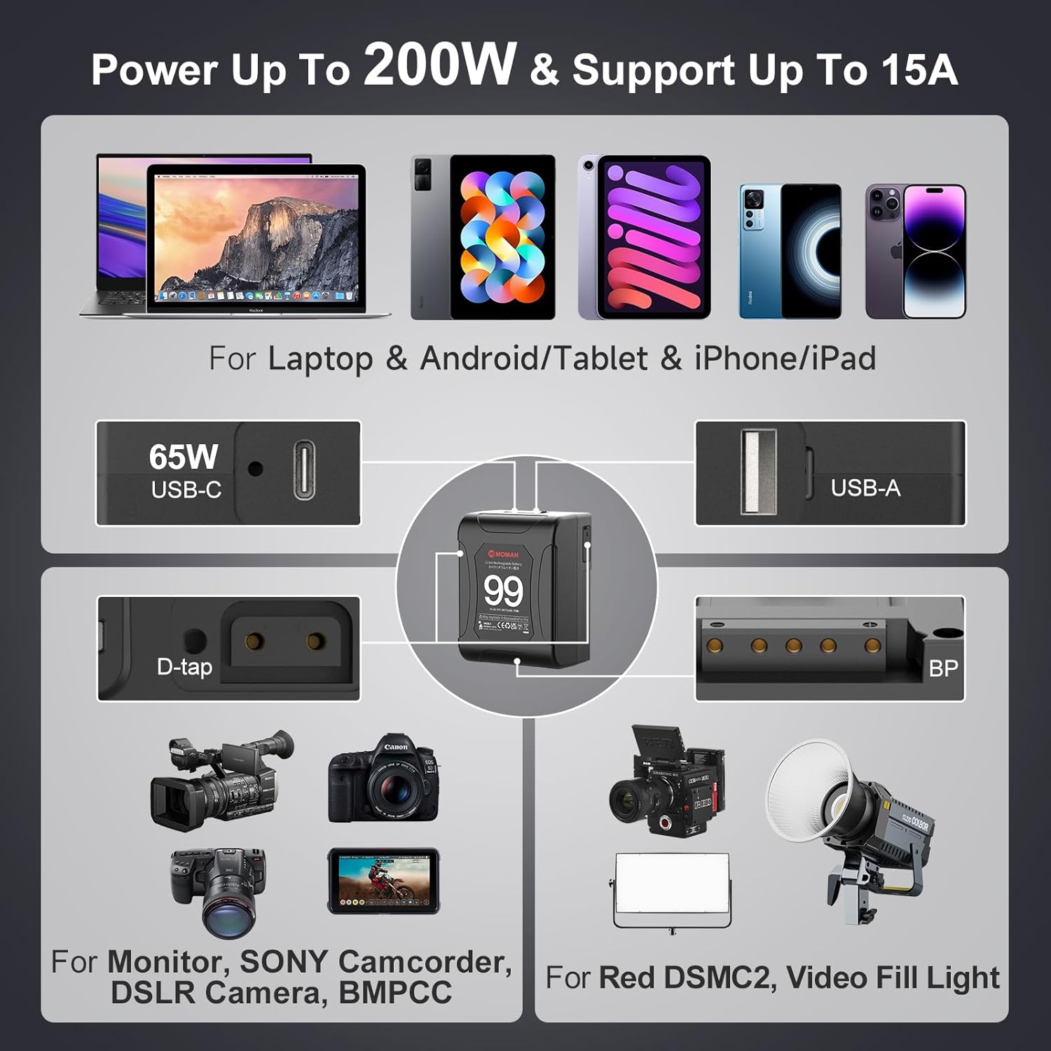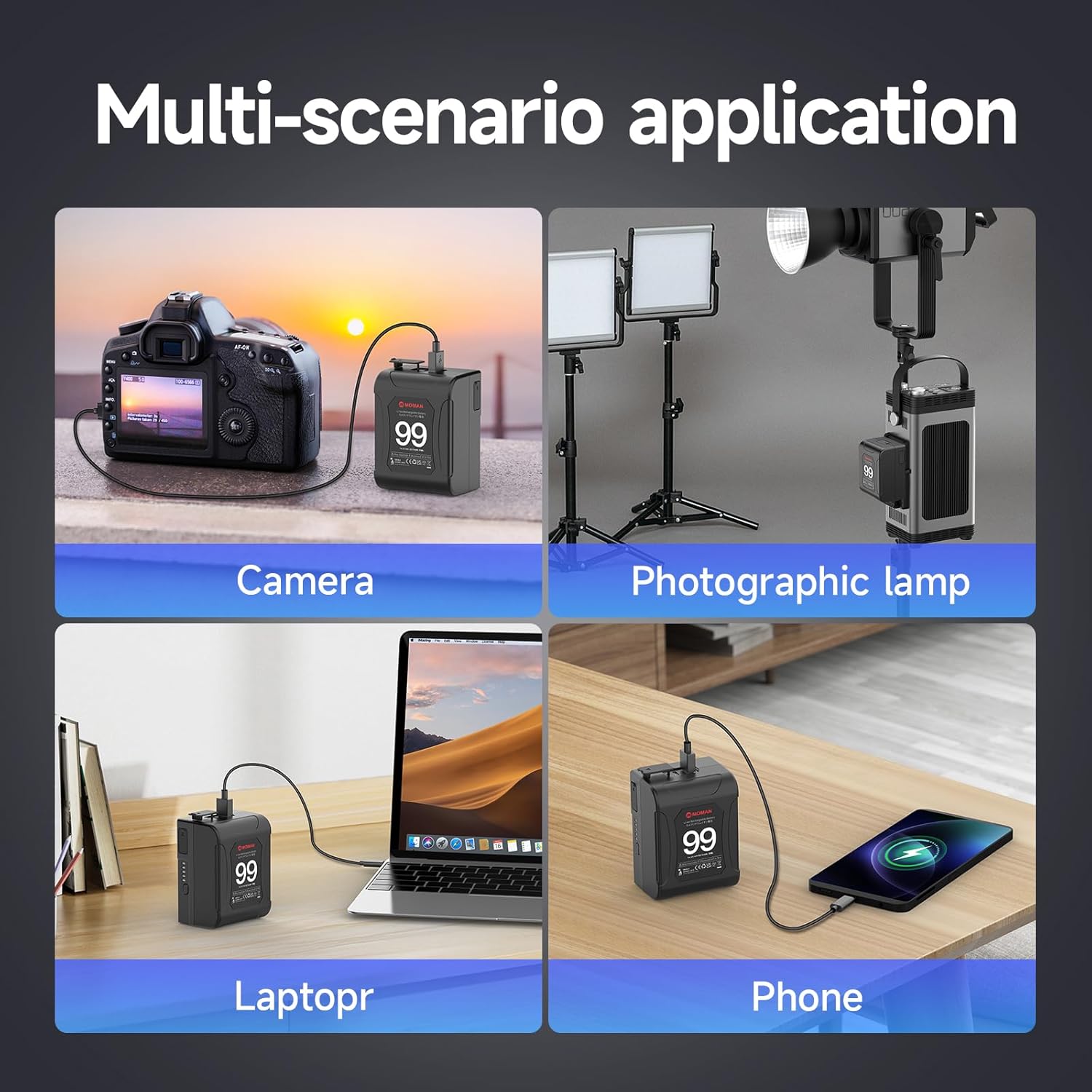 - ✅【Vielfältige Ausgänge für Filmemacher 】Moman Power 99 bietet zwei D-Tap und zwei USB-A Ausgänge, um verschiedene Kameraausrüstungen wie Camcorder, Feldmonitore, Video Transmitter mit Strom zu versorgen und sogar Tablets, Smartphones und